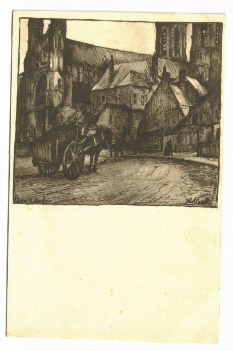 Открытка ПМВ. ОРИГИНАЛ.зарисовки Карла Лотце когда началась Великая война вернулся в Германию и поступил на службу в пехоту. Его полк был назначен для кампании во Франции, он заболел тифом в 1915 году и был отправлен в больницу в Лаоне. Не в состоянии возобновить обычные обязанности, он был назначен официальным военным артистом 7-й армии. Он провел остаток войны в окрестностях Лаона, запечатлев множество сцен с транзитными войсками и портретами немецких солдат. Многие из этих темных задумчивых рисунков были использованы на мелкоопечатанных полевых карточках. размер 9 х 14 см. Отличная сохранность.