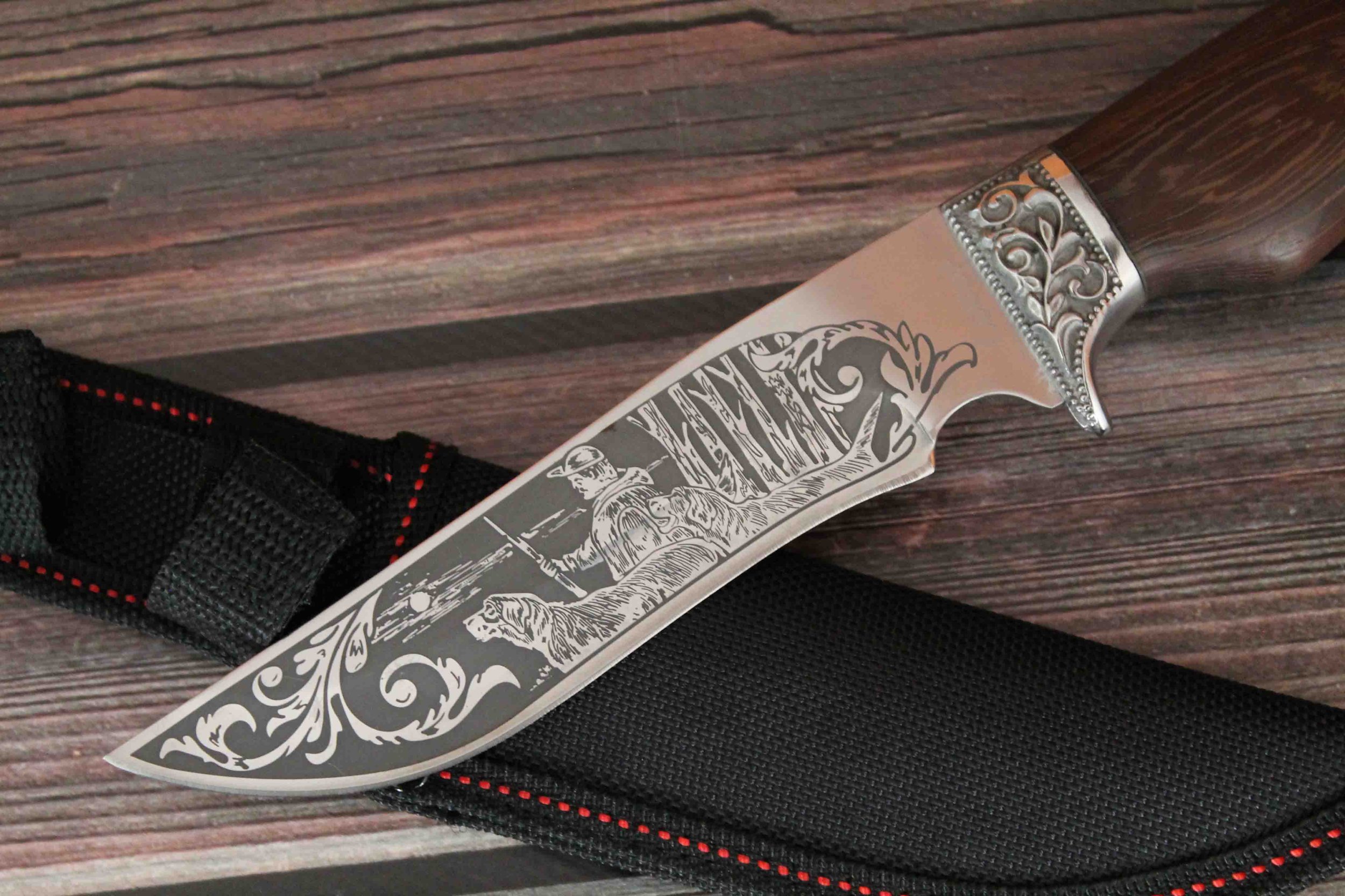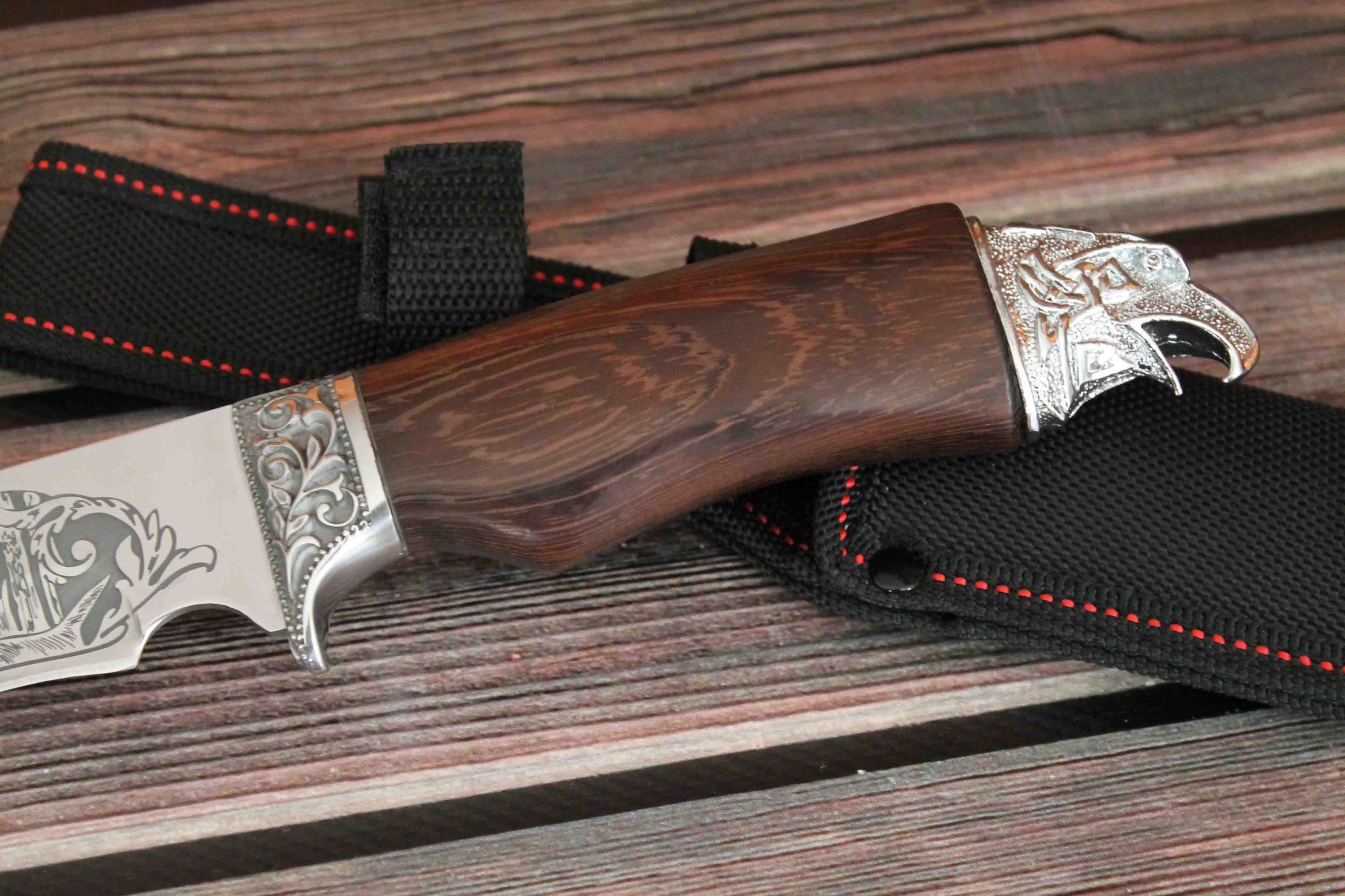 Нож с фиксированным клинком «Сокол» сочетает в себе высочайшее качество и красоту. Данный нож универсален, он подойдет для охоты, рыбалки и туризма. Нож «Сокол» имеет клинок со взлетающим кончиком восточного типа и высокие спуски. Такая форма клинка обеспечивает ровный и четкий рез по материалам любой плотности. Объемная рукоятка из специально мореного дерева обеспечивает уверенный хват что позволяет точно контролировать усилие, передаваемое от руки на режущую кромку. Клинок из высококачественной нержавеющей стали сохраняет остроту в течение длительного времени и легко правится. На клинке расположен детальный рисунок выполненный методом травления.