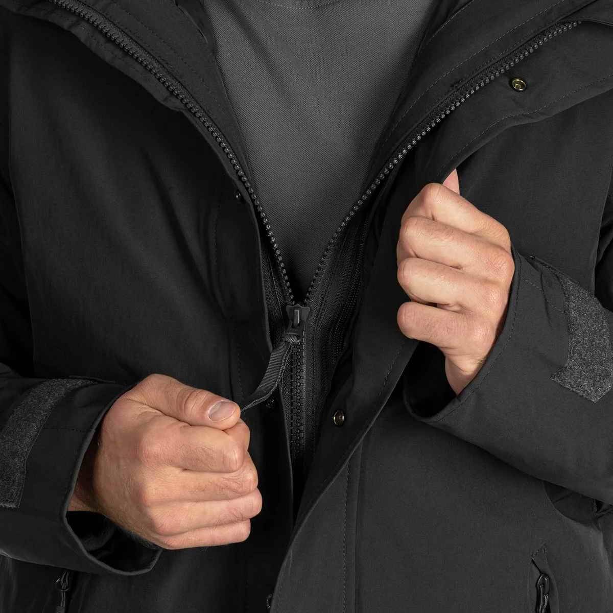 Парка Wet Weather Jacket With Fleece Liner от Sturm Mil-tec создана, чтобы защитить от осадков и согреть даже в самый холодный день. Она подходит как для повседневного использования в городе, так и для длительных прогулок на морозном воздухе. Модель данной куртки состоит из двух изделий – верхняя мембранная и внутренняя утепляющая флисовая куртка, которые можно использовать вместе или отдельно, как самостоятельные изделия. Верхняя куртка обеспечивает максимальную защиту от снега, дождя и ветра благодаря конструктивным особенностям и влагозащитному материалу. Внутренняя куртка-подкладка способствует максимальному сохранению тепла и улучшению терморегуляции благодаря дышащему флису. Парк имеет шесть карманов: два нижних, два внутренних под клапаном и два нарукавных с влагозащитными молниями. Центральная молния с интегрированной защитой подбородка имеет ветро-влагозащитный клапан, что делает невозможным попадание влаги и ветра внутрь. Дополнительно предусмотрена внутренняя снежная юбка, а объем манжет можно отрегулировать липучкой. Также под мышками размещены специальные молнии, которые позволяют высвободить из-под куртки лишнее тепло не открывая центральную молнию, что очень удобно во время активных ненастных действий. Внутренняя куртка-подкладка имеет двухстороннюю центральную молнию, два кармана и молнии и эластичный утягивающий шнурок в нижней части. Материал, из которого изготовлена Wet Weather Jacket, это влагостойкая трехслойная мембрана. Такая ткань отлично справляется с защитой от осадков и выведением излишних испарений от тела. У этой мембраны показатель водонепроницаемости 5000 мм, а дышащие свойства 500 г/м2 за 24 часа. Это базовые показатели, чего предостаточно для ежедневного использования в городе или прогулок на природе. Все швы проклеены герметично, поэтому можно не опасаться за сухость под курткой даже в сильный дождь. Внутренняя куртка-подклад изготовлена из флиса, что обеспечивает хорошую воздухопроницаемость и отвод лишних испарений от тела. Этот материал также хорошо сохраняет тепло даже когда намокает.