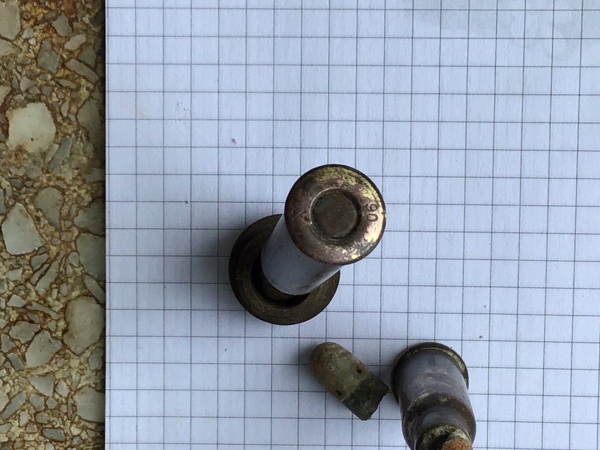 Патроны находились на вооружении Русской, а затем Красной армий до середины 20-х годов. Пуля имеет 4 отверстия, через которые выдавливалась смесь при стрельбе. Вес пули 4,77гр. Гильзы производства Австрийского и Петербургского заводов. Из повреждённой пули получился разрез. Отдельно пуля вынута из повреждённой гильзы и на фото видно какая она. Вот такой получился лот. Гильзы немного почищены от прилипшей местами ржавчинки, образовавшейся от других железных предметов...