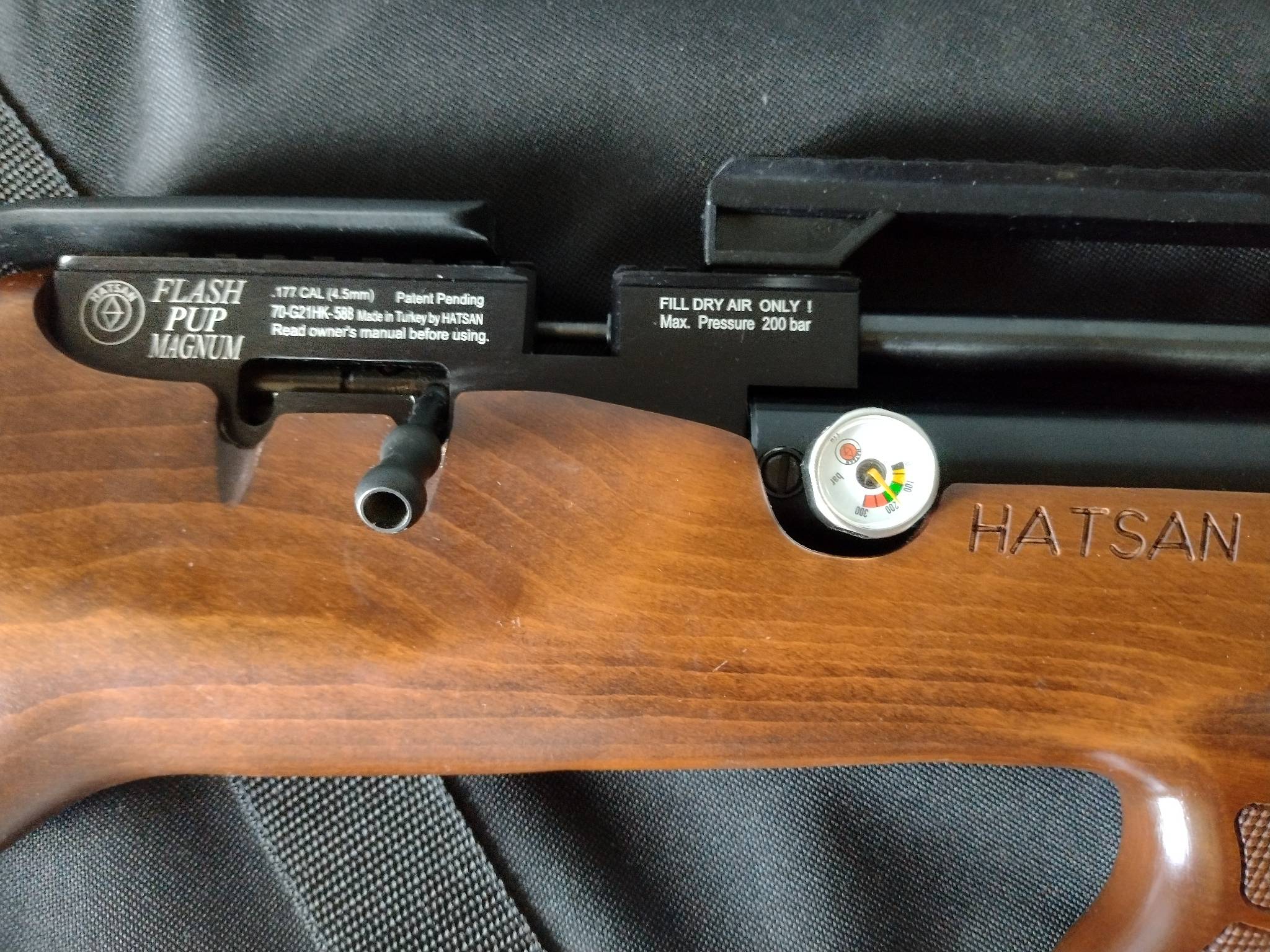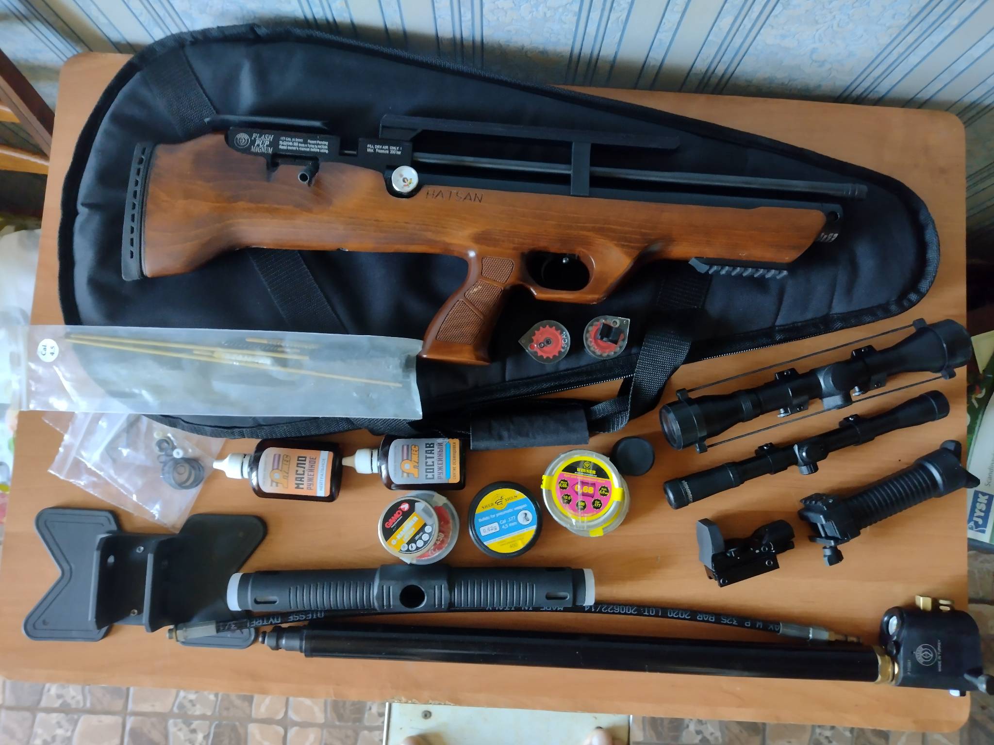 Комплект: PCP винтовка Hatsan Flashpup W bullpup set, Насос высокого давления для пневматики Hatsan, Оптический прицел Optima 4X32, Два магазина по 14 пуль, Вставка для однозарядного выстрела, ЗИП, Чехол, Рукоять-сошки, Набор для чистки, Накладка на рычаг затвора, пули(5 банок), документы.