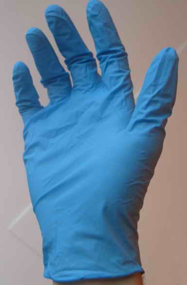 Одноразовые перчатки. Новые. Изготовлены из нитрилового резинового материала, нетоксичные, асептические. Без талька. Цвет голубой (как на фото). Левая и правая одинаковые.
