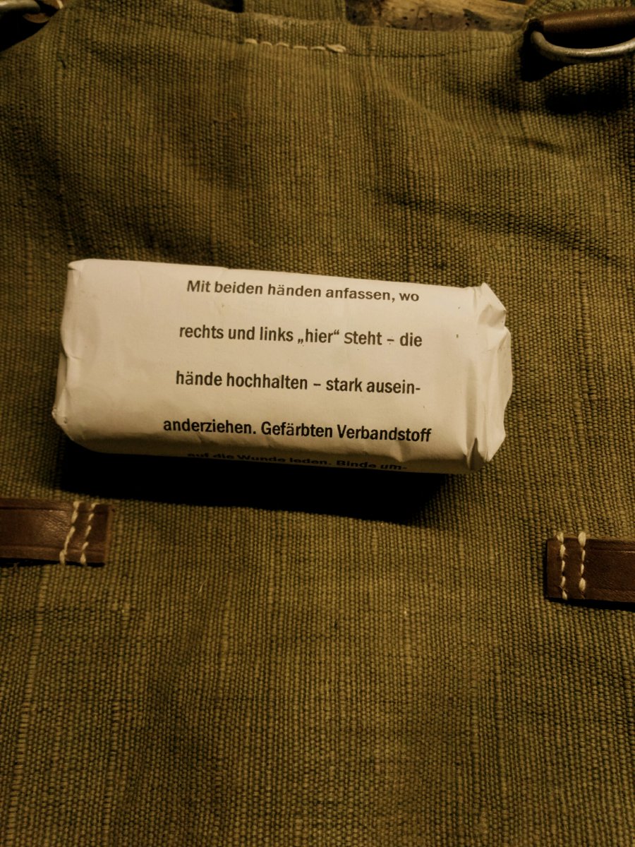 В малом пакете - упаковка стерильных марлевых салфеток. В большом - два бинта (стерильный и нестерильный). Завернуты в бумажную упаковку с инструкцией на немецком языке. Тканевая упаковка - многоразовая, специально полностью не заклеиваю. Срок годности - до 22-23 года.