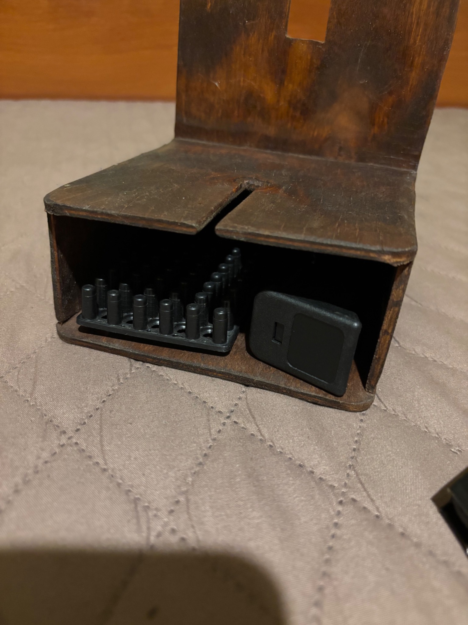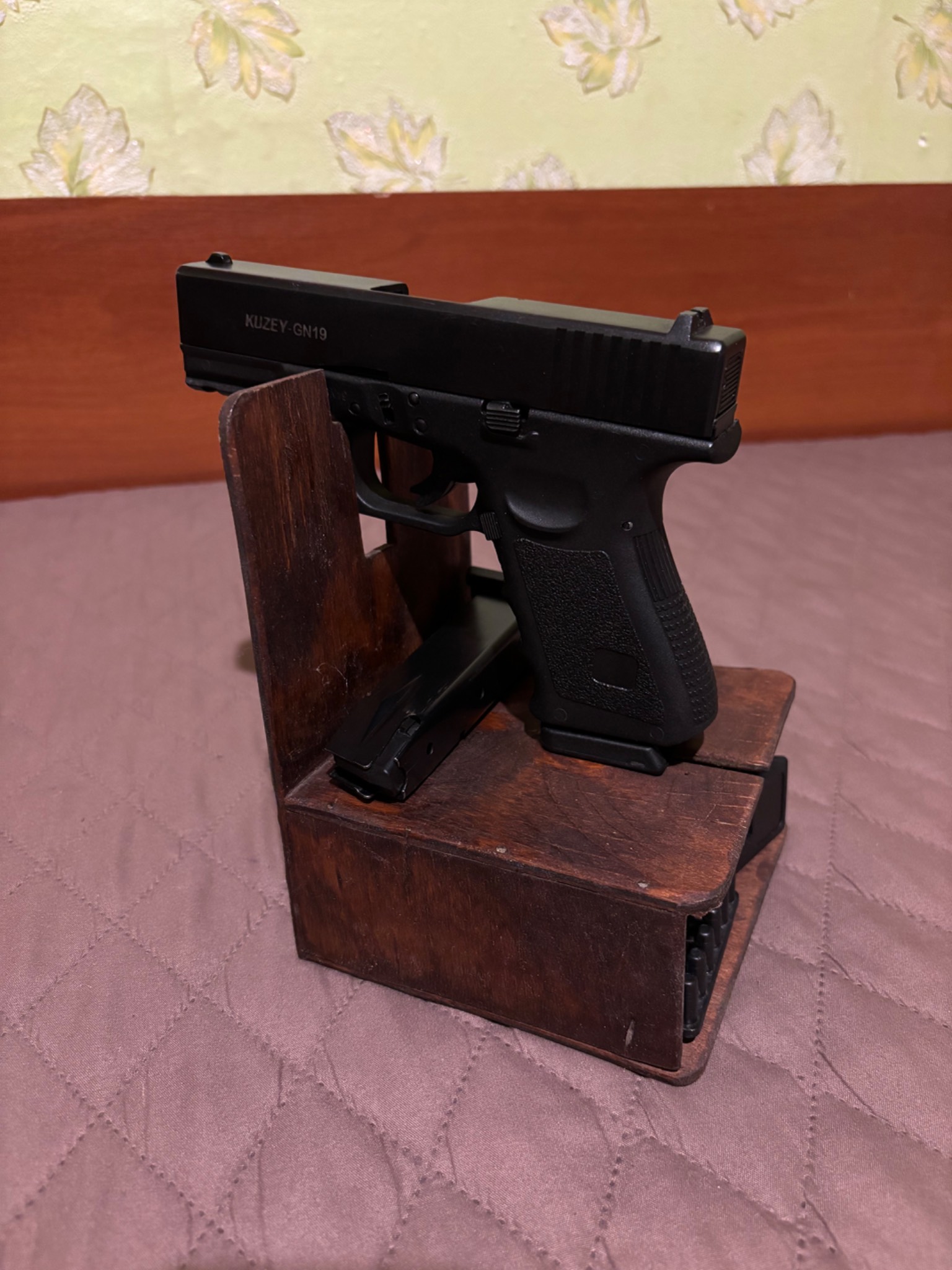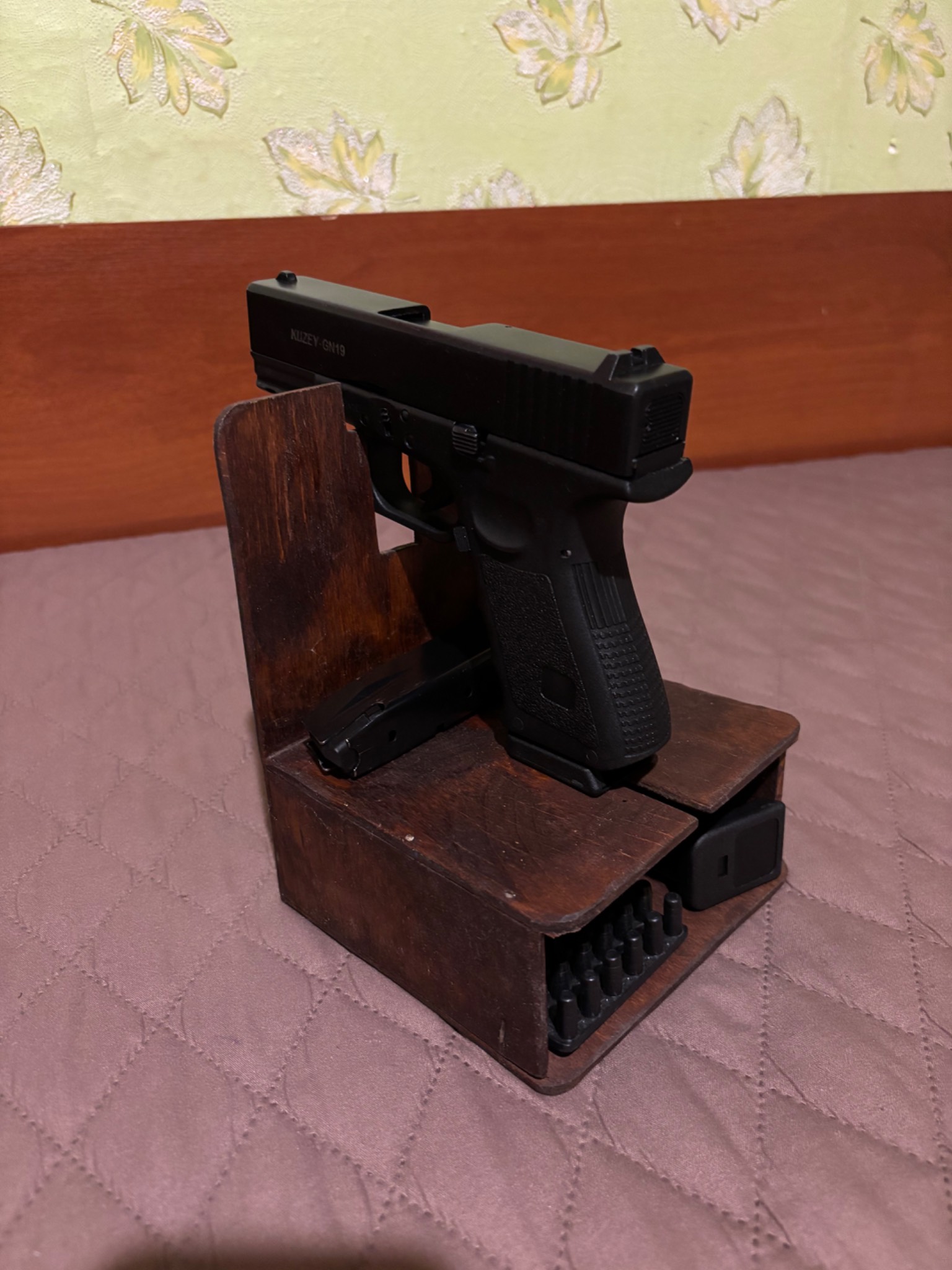 Деревʼяна, лакована підставка під пістолет, додаткові магазини та набої, пістолет в дот не входить фото для прикладу, у доті підставка та пластмасова платформа для нобоїв, дивіться інші мої лоти багато цікавого по тематиці