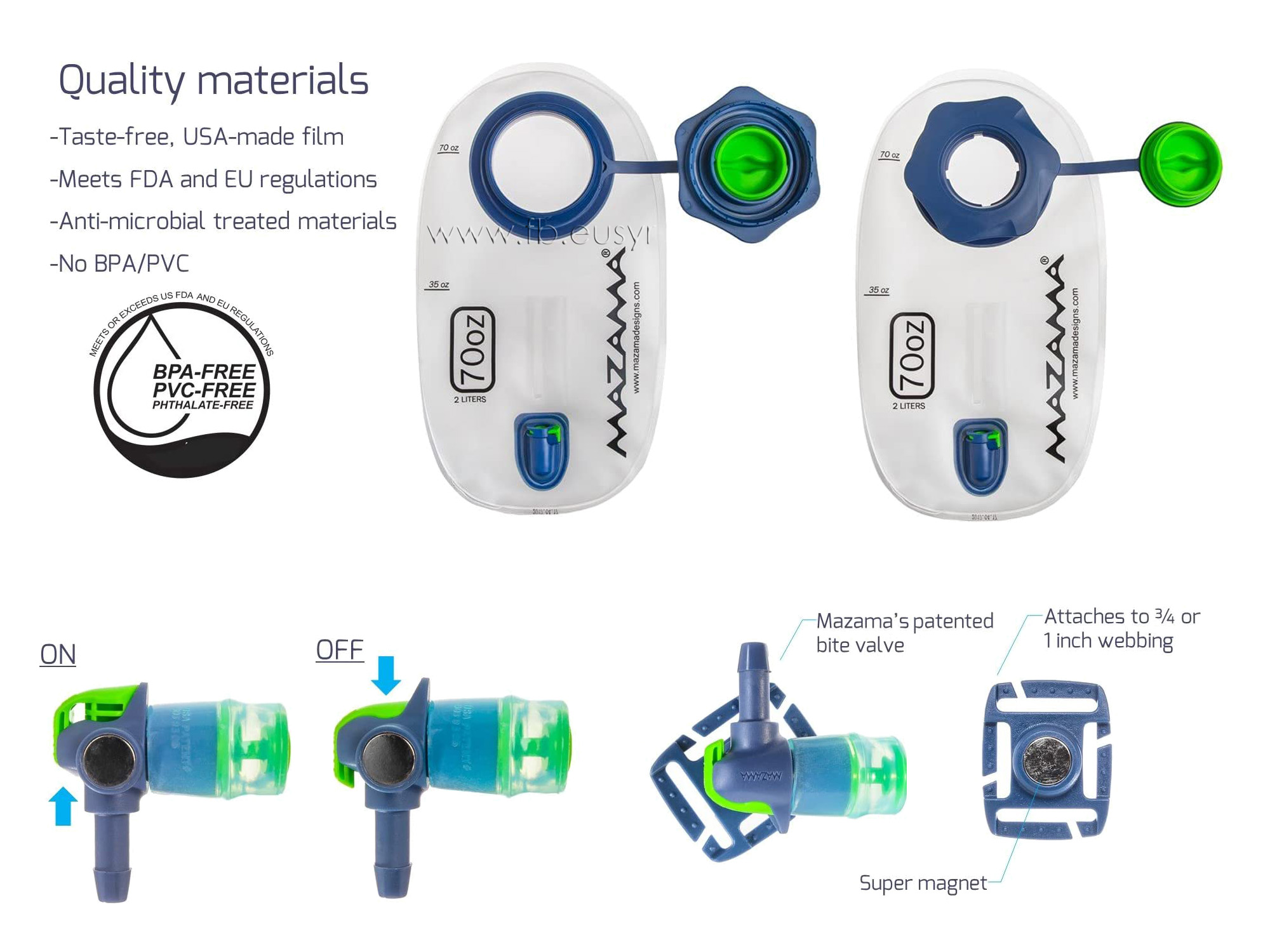Резервуар гідропака об'ємом 2 літри виготовлений з поліуретану, що не містить BPA, який виготовлено в США та схвалено управлінням з санітарного нагляду за якістю харчових продуктів і медикаментів в США. Цей матеріал дозволяє резервуару бути гнучким і стійким до проколів. Центральна перепонка дозволяє резервуару підтримувати низький профіль. Завдяки широкій подвійній горловині його можна легко наповнити водою і промити. Шланг швидко з'єднується/від'єднується і оснащений клапаном. За допомогою потужного магнітного тримача поїлку можна легко закріпити за стропу рюкзака. Не містить BPA (бісфенол А), не містить фталати і PVC (полівінілхлорид). Новий. Оригінал зі США.