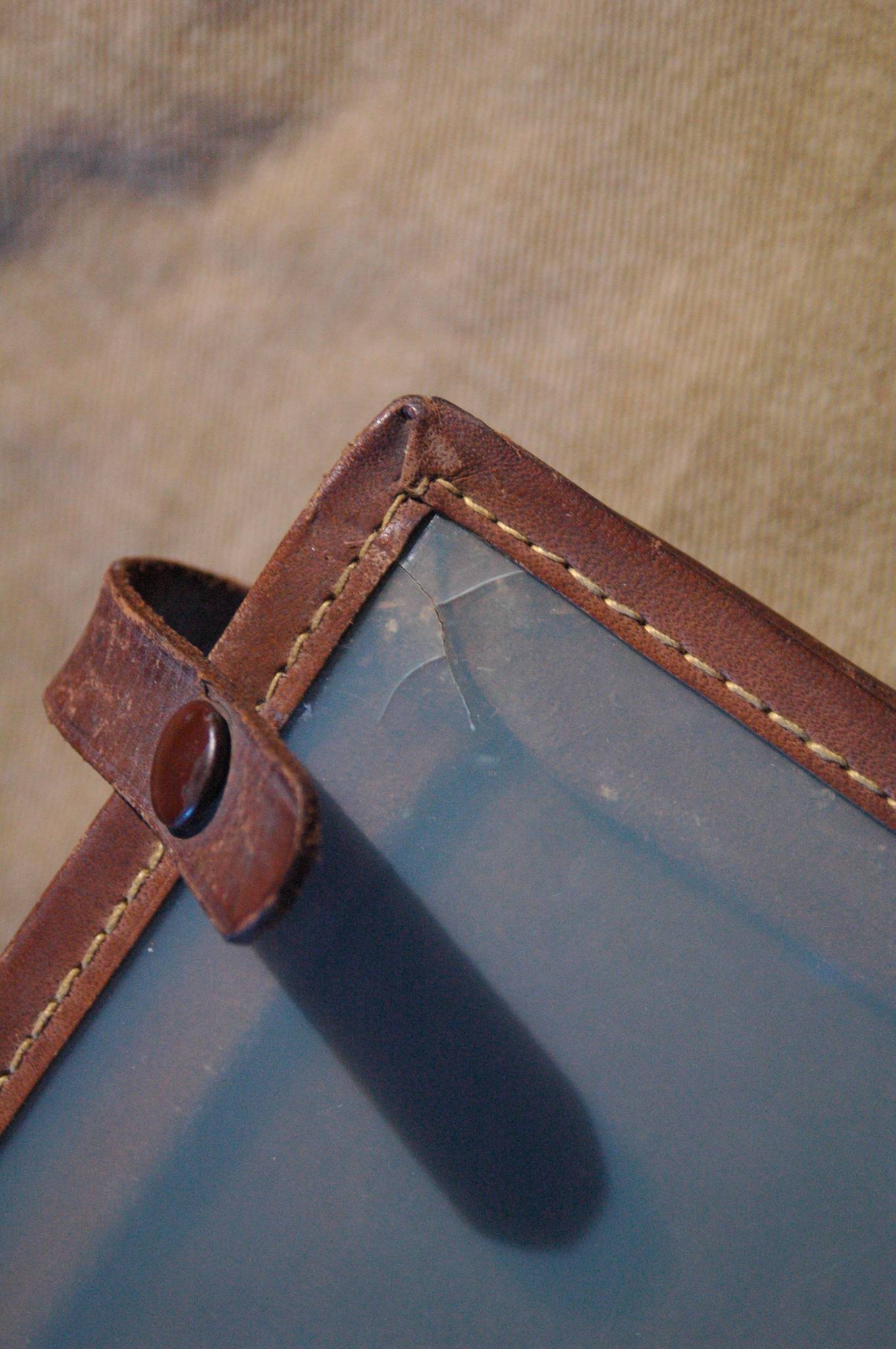 Матеріал - шкіра, в хорошому стані незважаючи на вік предмету та поверхневі подряпини, скрипить. Сумка ремонтувалася: кришка нерідна, фурнітура копана, але в хорошому стані, черезплічний ремінь новісінький, деякі шви ремонтувалися і перепрошиті через зношеність рідних ниток, невелика тріщина на целулоїді в куті панелі (див.фото)