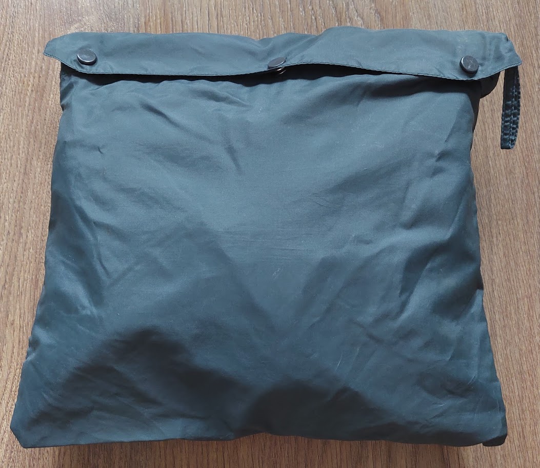 На спине в районе плеч - сетка, карманы - сквозные, при необходимости плащ - складывается в чехол и застёгивается на 3 кнопки. На левом плече есть пуговица - для крепления погона.