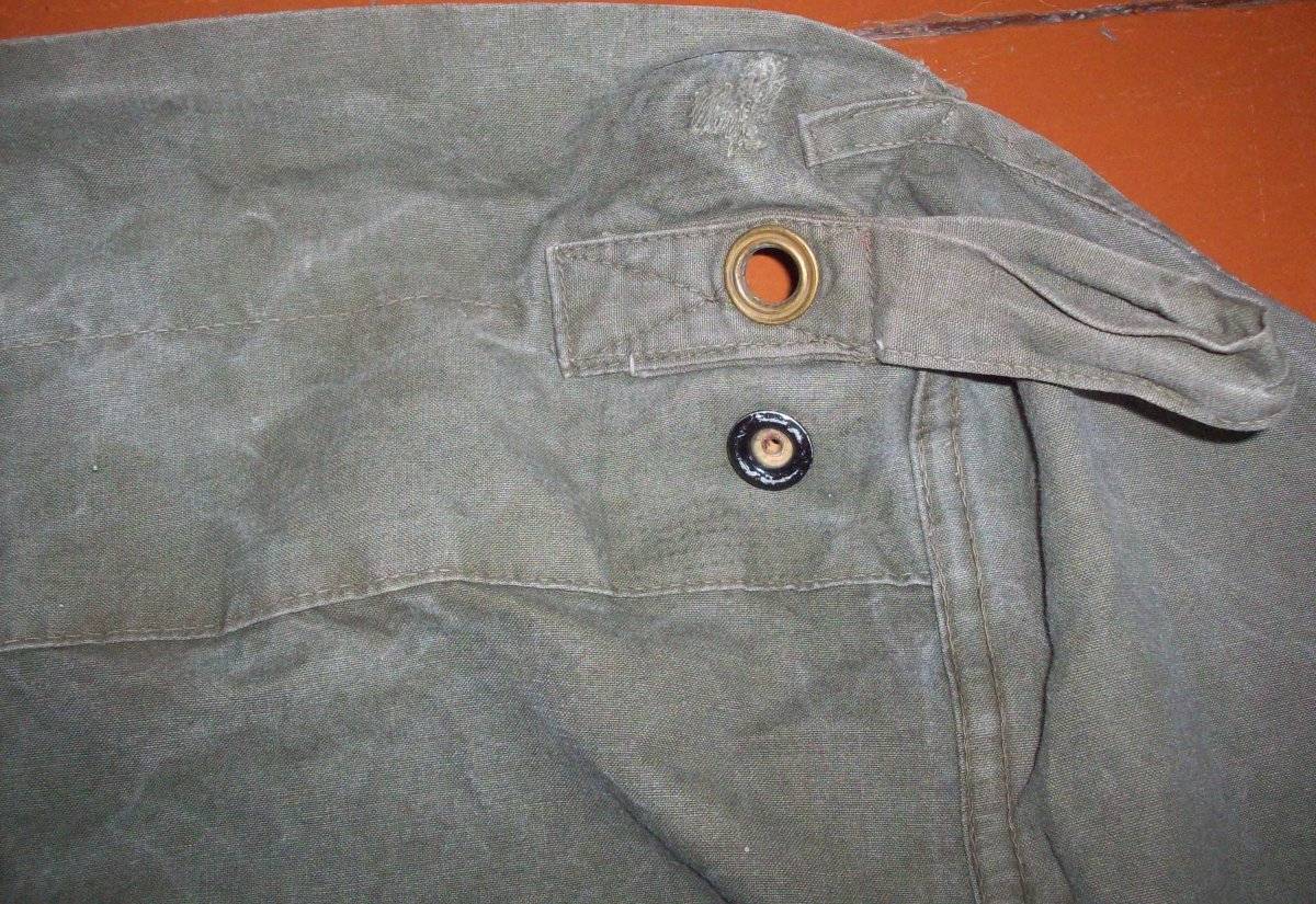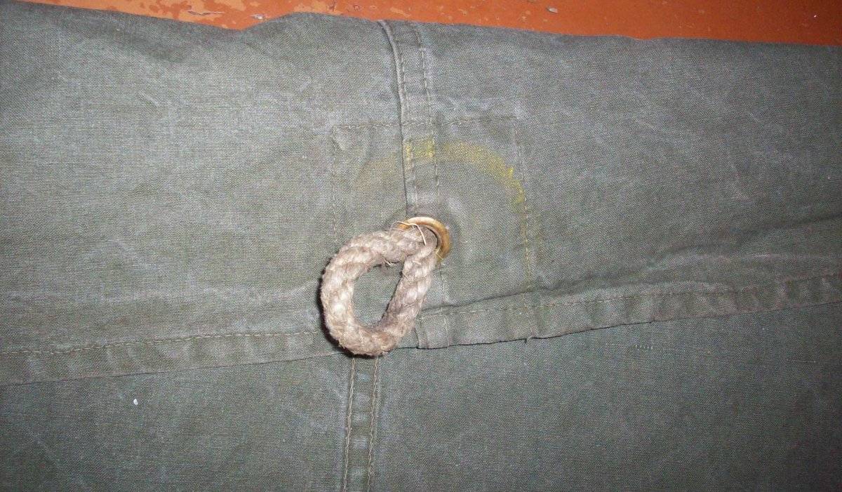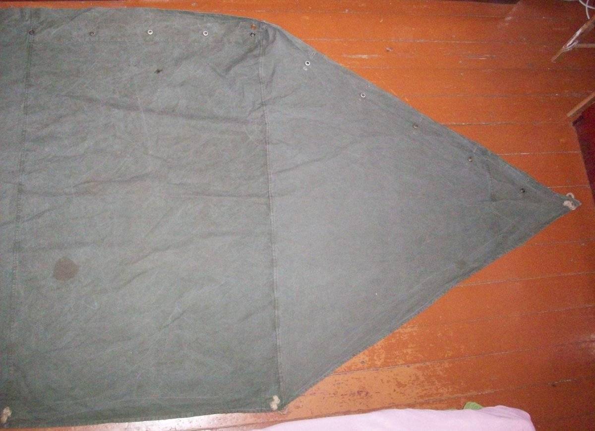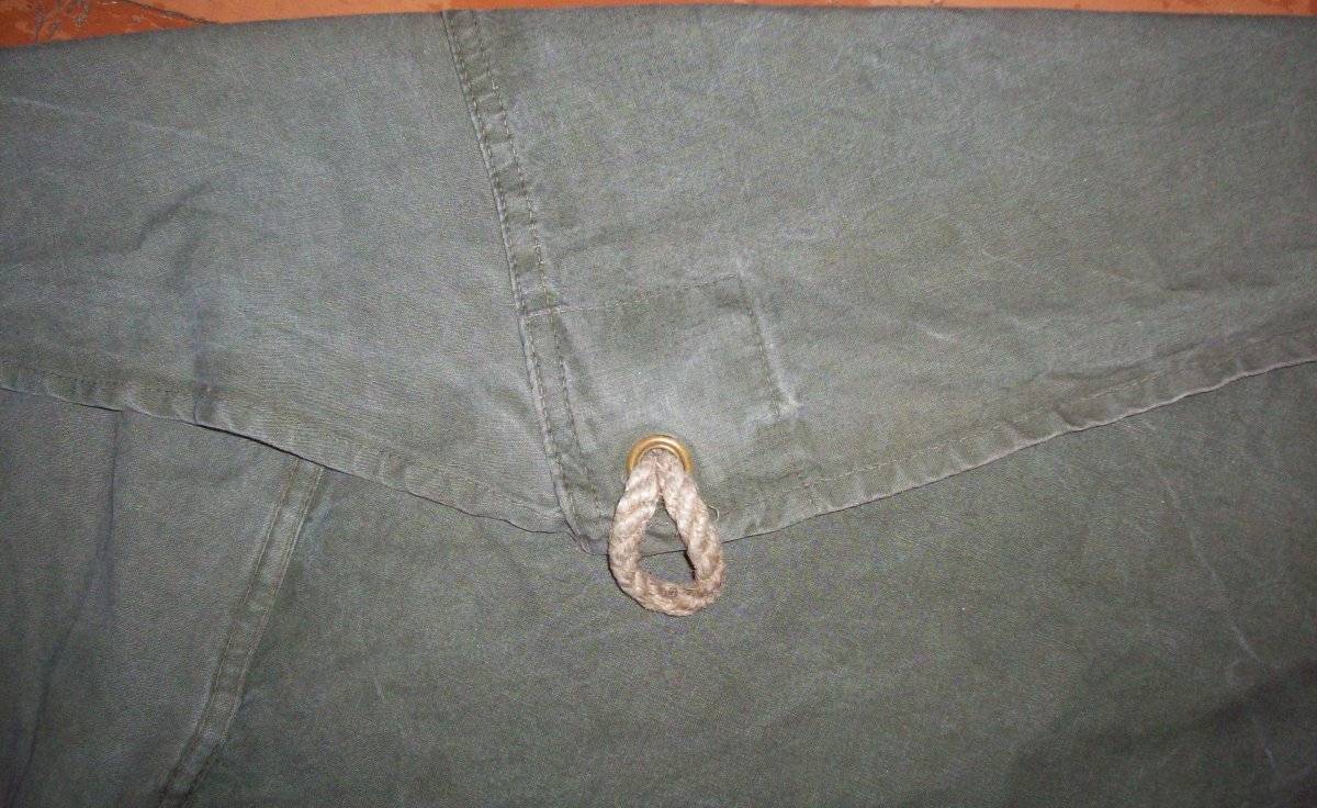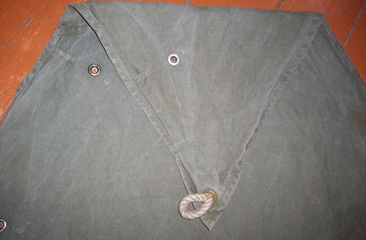 Есть пара пятен и заштопанных мест, как и у любой другой б/у вещи - во всем остальном полностью целый и утилитарный предмет полевого снаряжения. Родные шнуры в люверсах также в наличии.