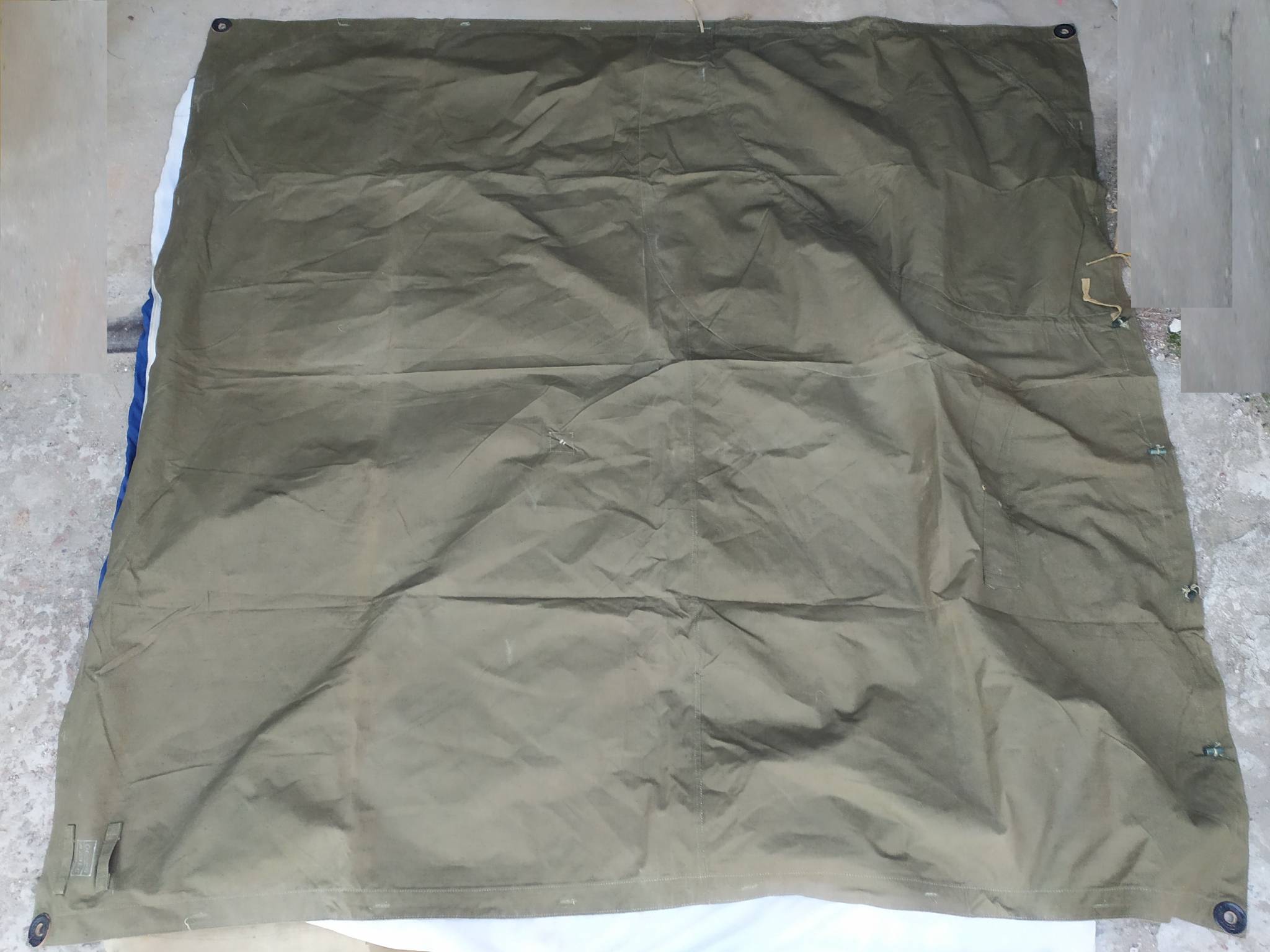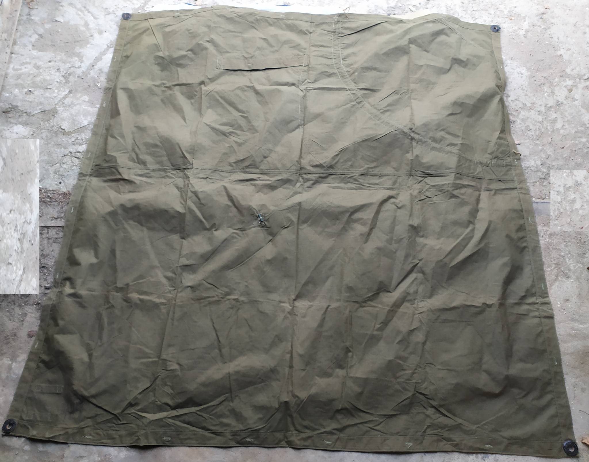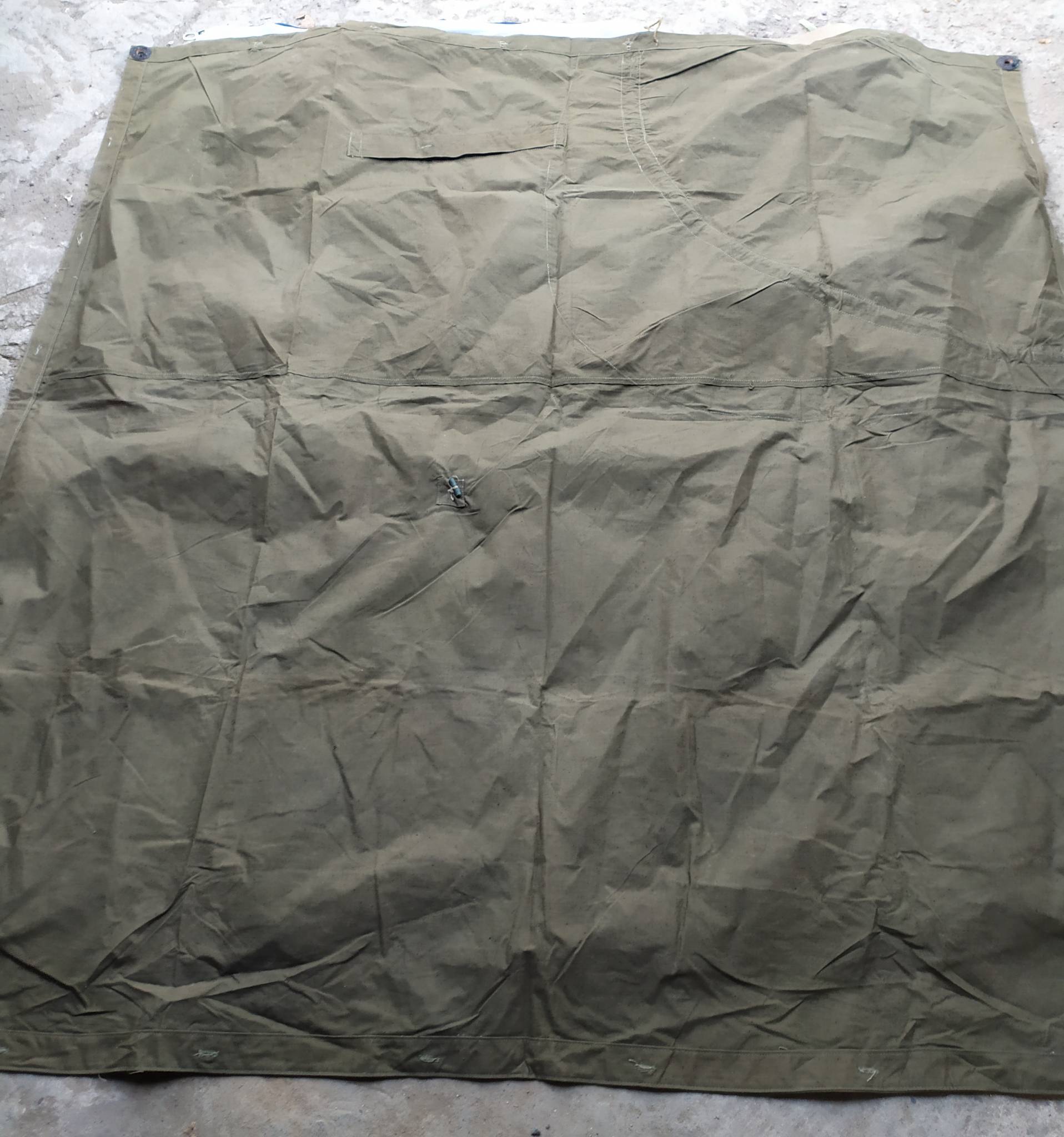 Советская солдатская плащ-палатка. Изготавливались из брезента. Может использоваться как плащ (есть вырезы для рук), тент, подстилка, переноска и т.д.. Из нескольких штук можно сделать палатку.