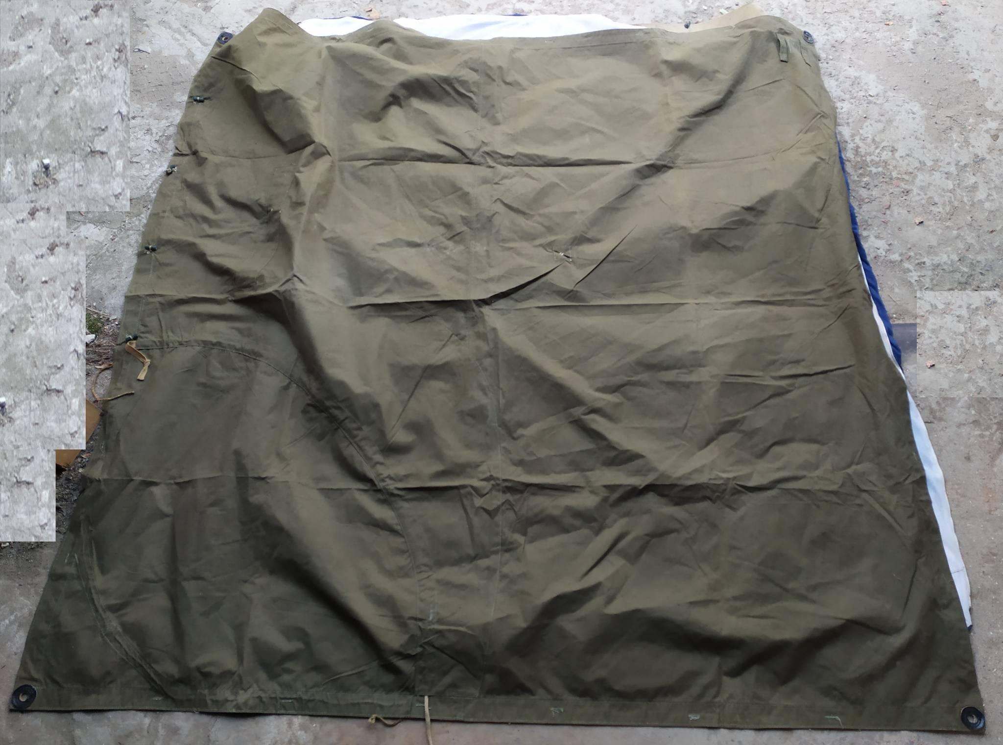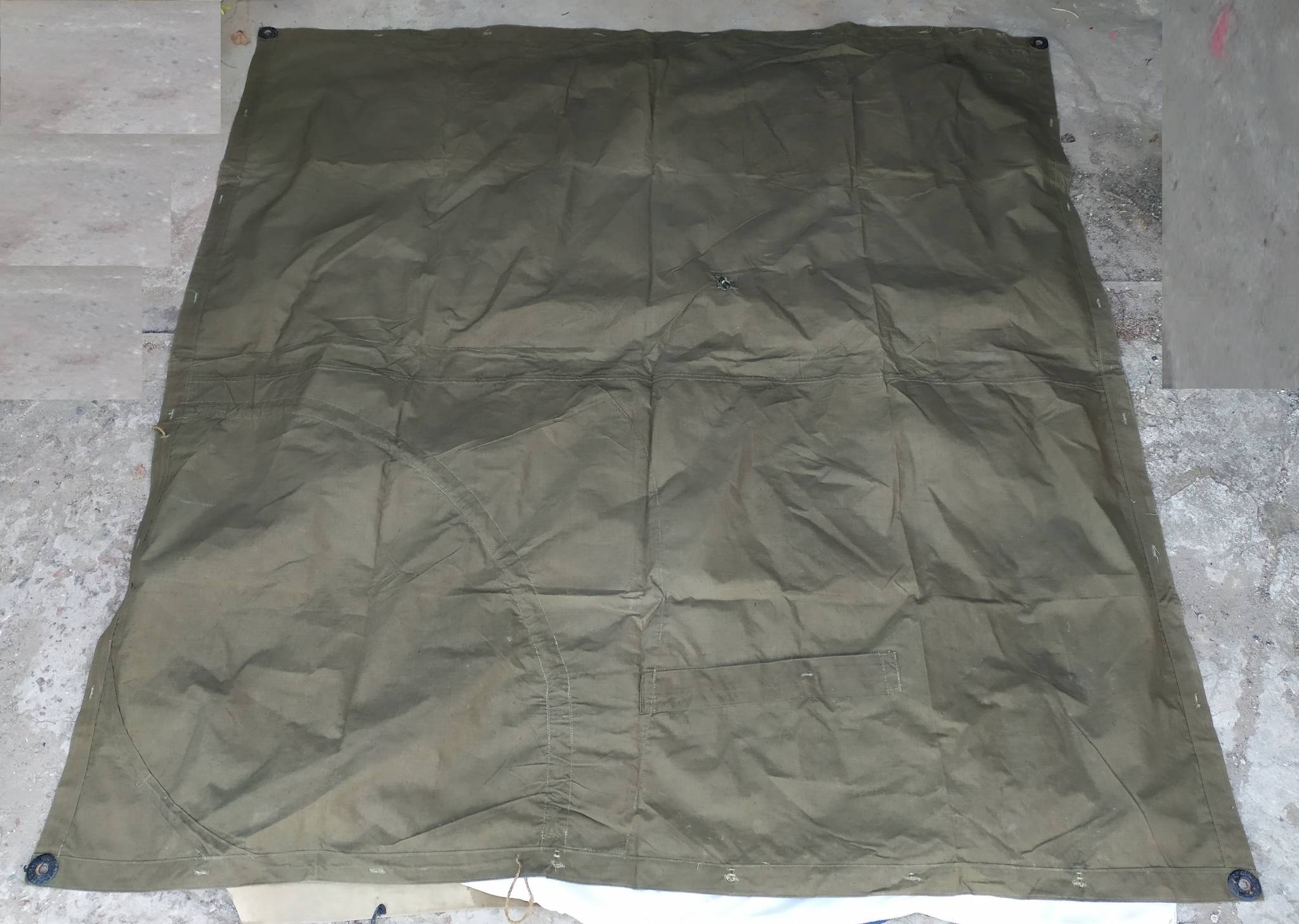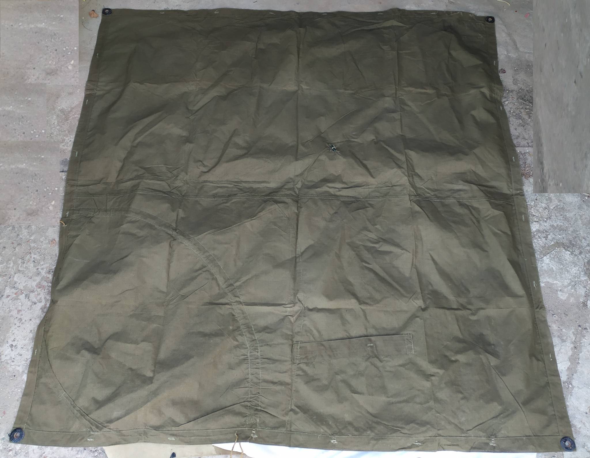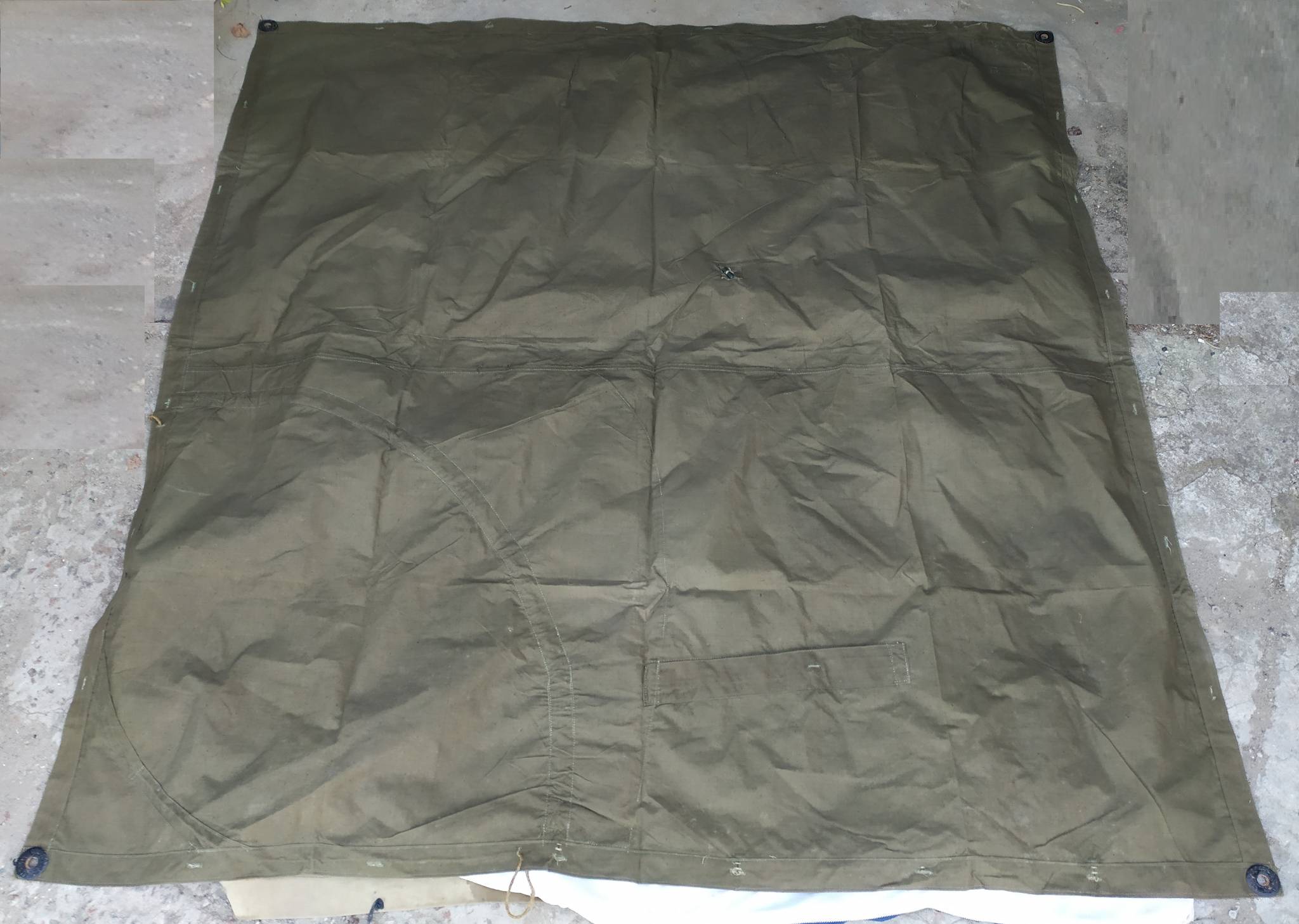 Советская солдатская плащ-палатка. Изготавливались из брезента. Может использоваться как плащ (есть вырезы для рук), тент, подстилка, переноска и т.д.. Из нескольких штук можно сделать палатку.