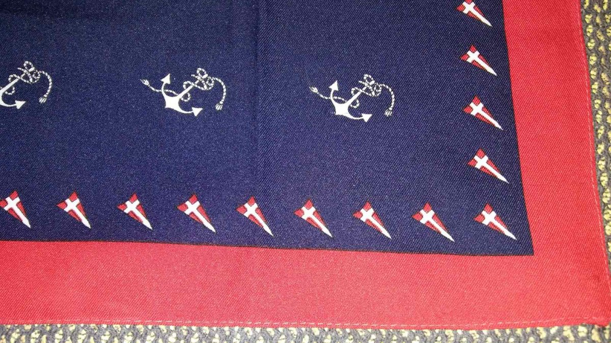 Хустина з якорями, темно-синя з червоною окантовкою, матеріал поліестер (штучний шовк), розмір 49 х 50 см, стан як новий.