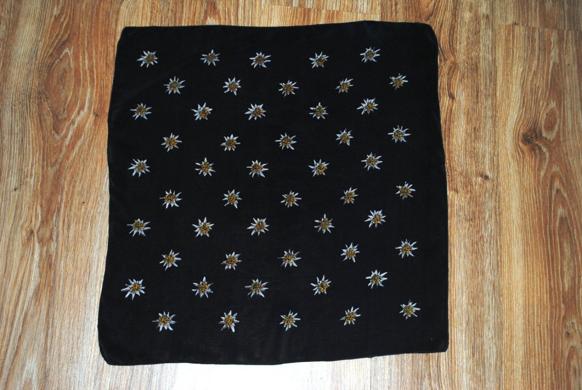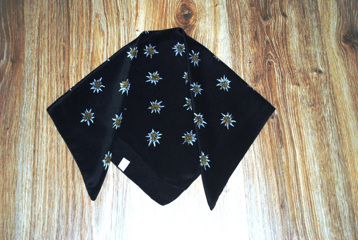 Черный шейный платок с эдельвейсами. Ткань - шёлк 100%. Размер 50х53 см.