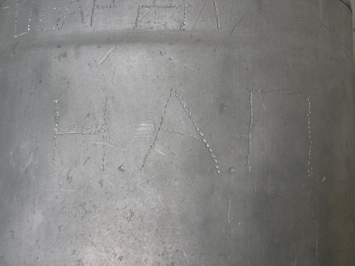 Спереди на котелке выцарапаны инициалы Н.А.П., по краю не доделана надпись "Повар дай каши" и цифры "184", на крышке выцарапаны буквы "ДС"
