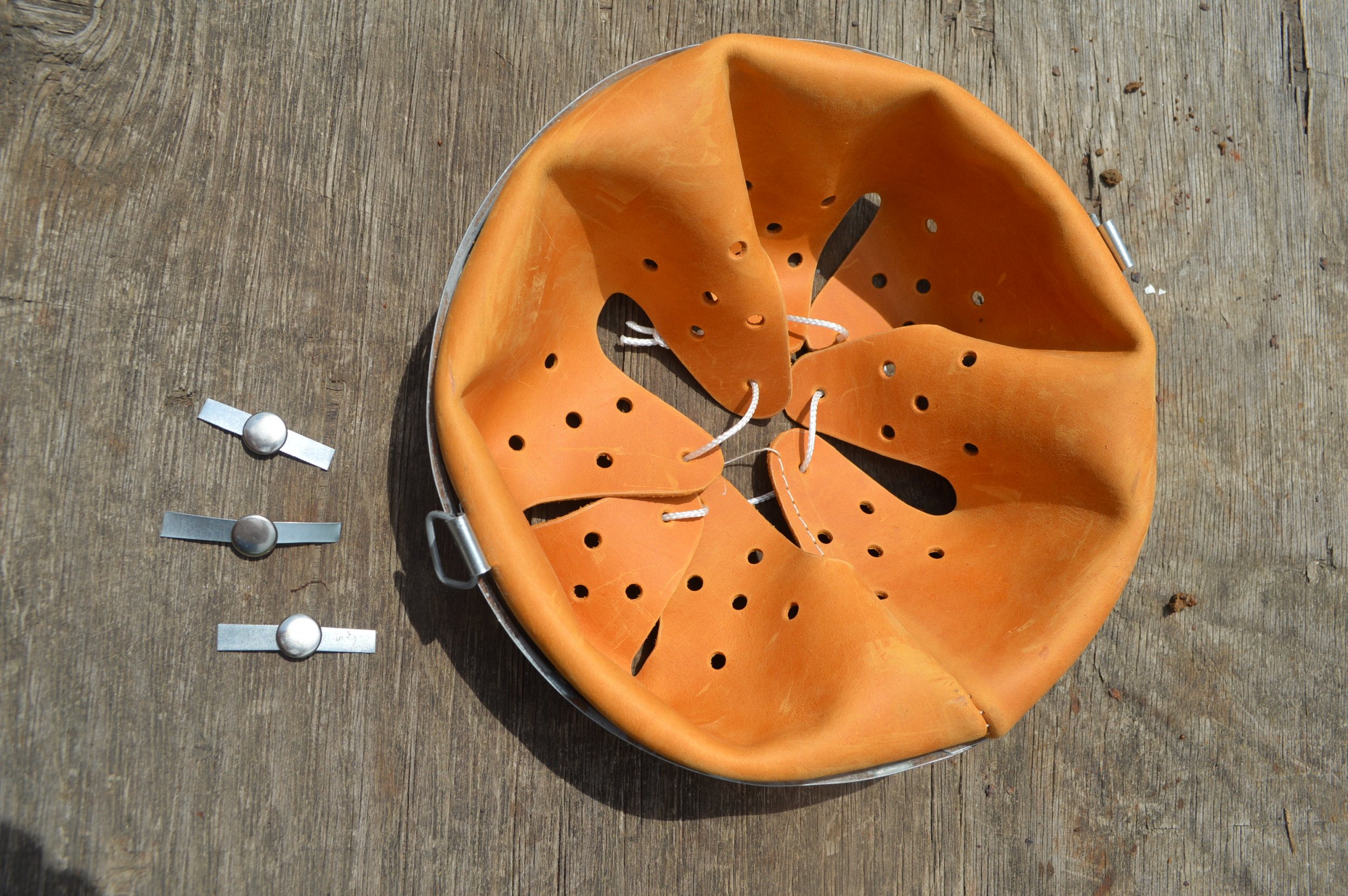 Подшлемник для немецкой каски.Есть 62 64 66 68 размеры. Для немецких касок м35. м40. м42. Кламмера крепления в комплекте. 1. Необходимые инструменты: плоскогубцы и 2 отвертки 2. Установка подшлема в каску. Главное, совместить отверстия под кламера. При установке подшлем можно чуть сжать руками. 3. Начинаем с установки заднего кламера, вводим широкую отвертку между обручами и отводим внутренний обруч с пружинами. Одновременно вставляем кламер и разгибаем другой отверткой с узким жалом его ножки. 4. Проверяем на совмещение отверстия под передние кламера. 5. Аналогично отводим отверткой внутренний обруч с пружинами и вставляем кламер. Далее разгибаем его ножки. 6. Ту же операцию делаем с последним оставшимся кламером. Обратите внимание, что задний кламмер лучше вставлять ножками вертикально, а передние кламера ножками горизонтально. Перед установкой ножки кламеров желательно ровно согнуть плоскогубцами.ЧТОБЫ ПРАВИЛЬНО ВЫБРАТЬ ВАШ РАЗМЕР НУЖНО ЗАМЕРЯТЬ КАК ПОКАЗАНО НА ФОТО И ОТНЯТЬ ОТ ДЛИНЫ 1,5-2 см.ЭТО БУДЕТ ВАШ РАЗМЕР