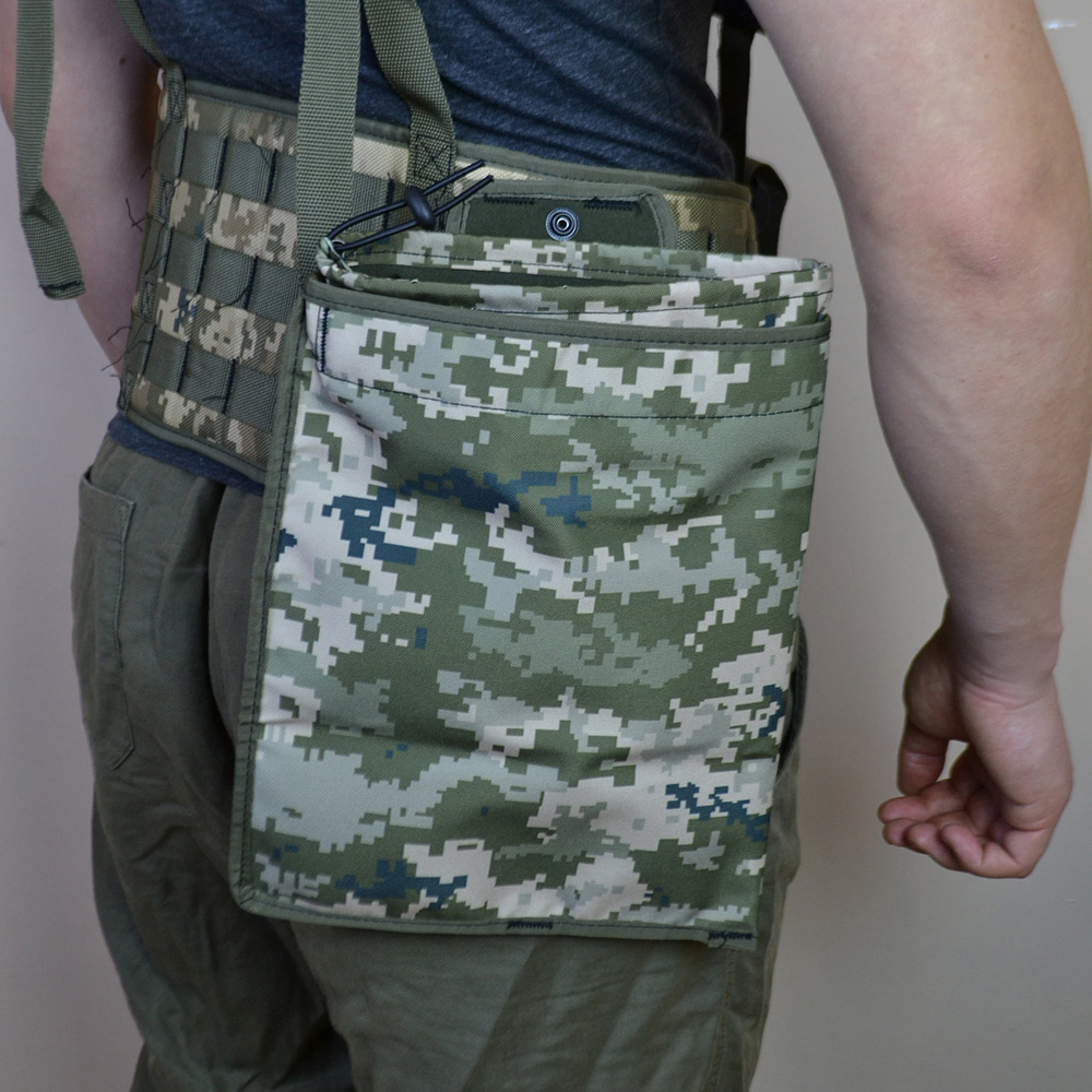 Качественный крепкий подсумок для сброса магазинов, выполненный из крепкой ткани CORDURA пиксель в два слоя, крепление MOLLE укреплено и качественное.
