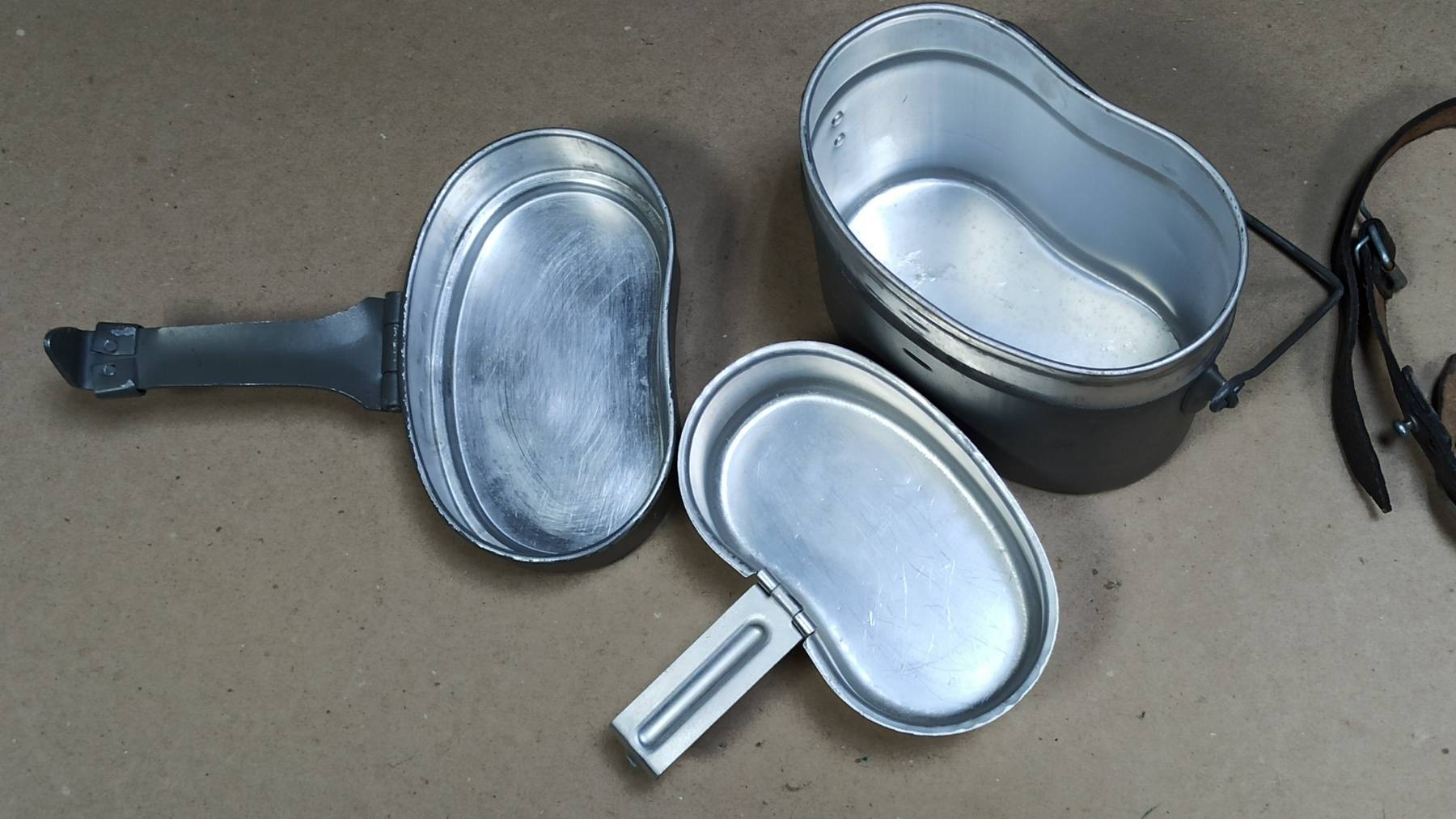 - Дополнительный черный кожаный ремешок, фиксирующий крышку и ручку на котелке в походном положении.