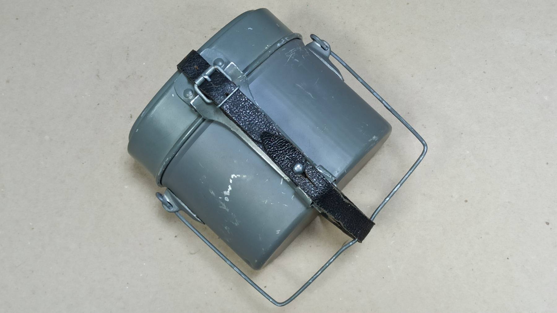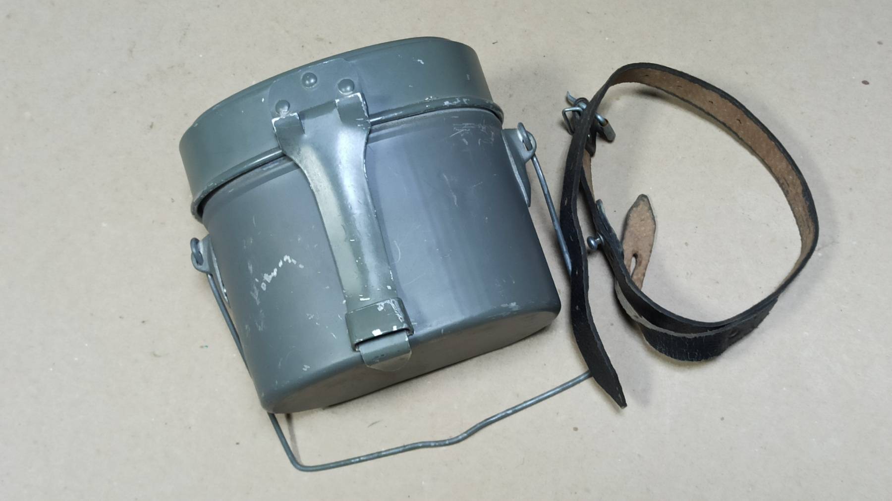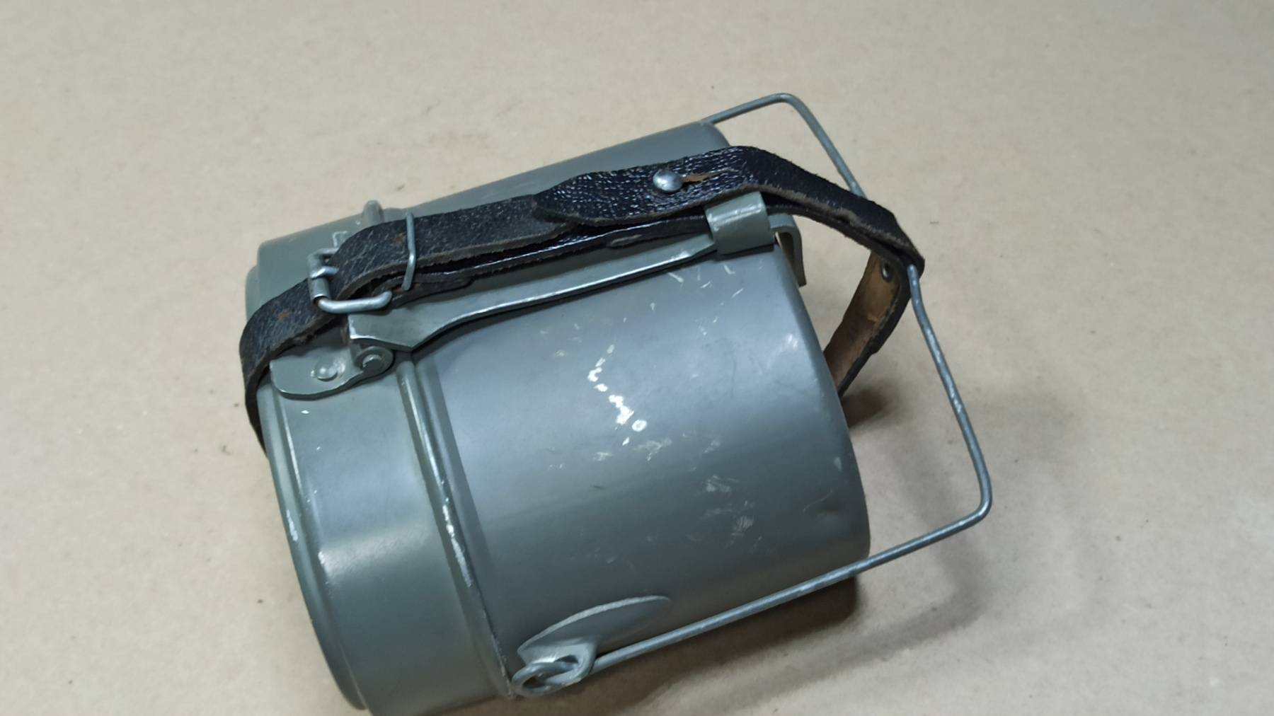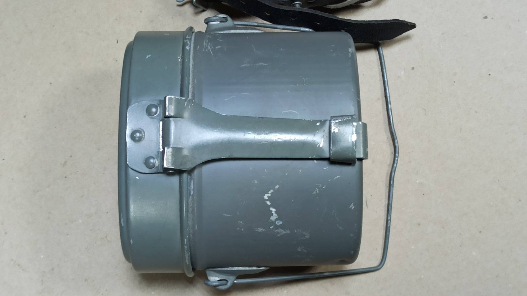 Оригинальный полевой котелок, ранней модификации, с кожаным ремешком для фиксации, Немецкой национальной народной армии, вооружённых сил ГДР. Образец снаряжения времен холодной войны, уже несуществующей армии и страны.