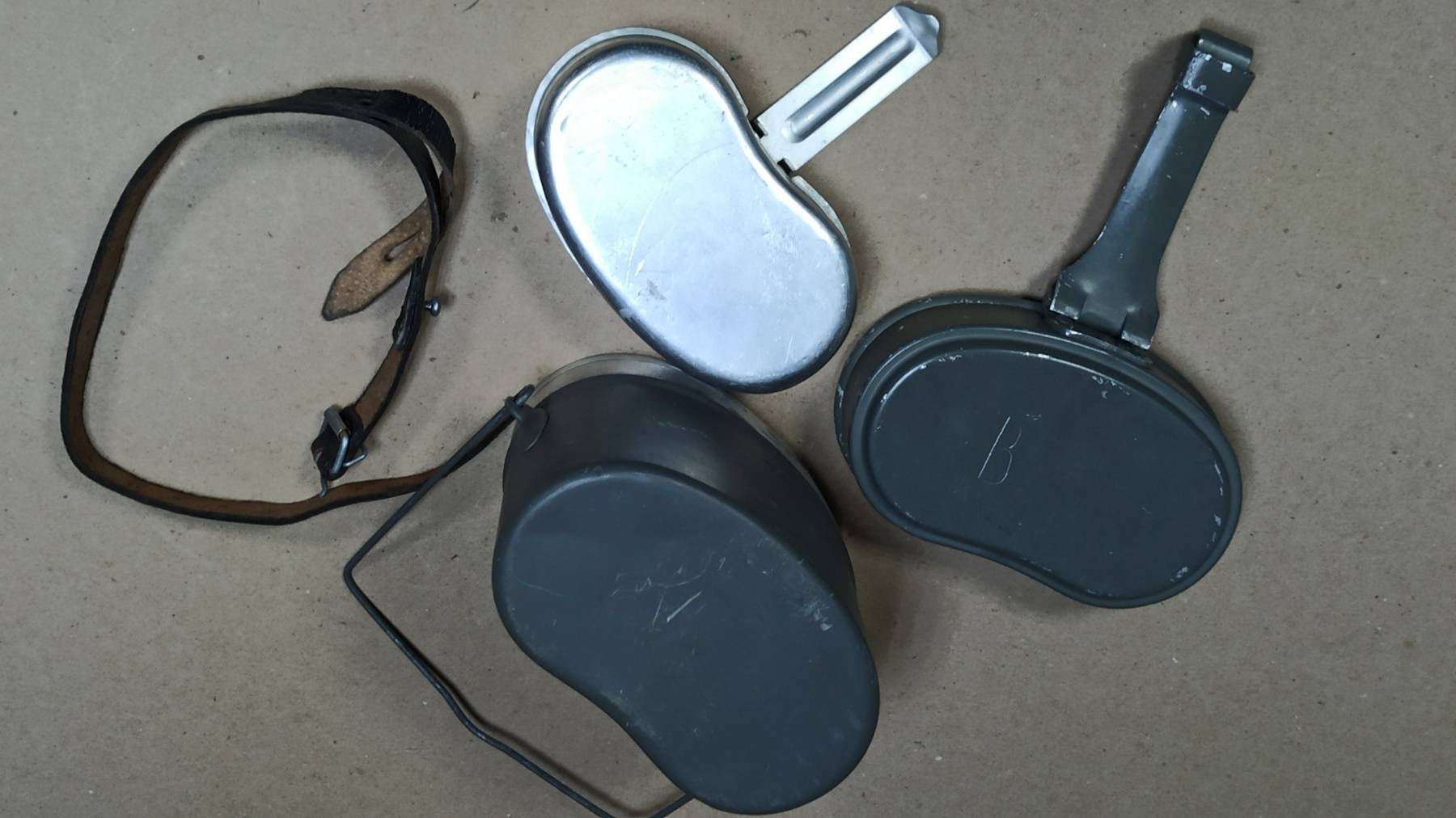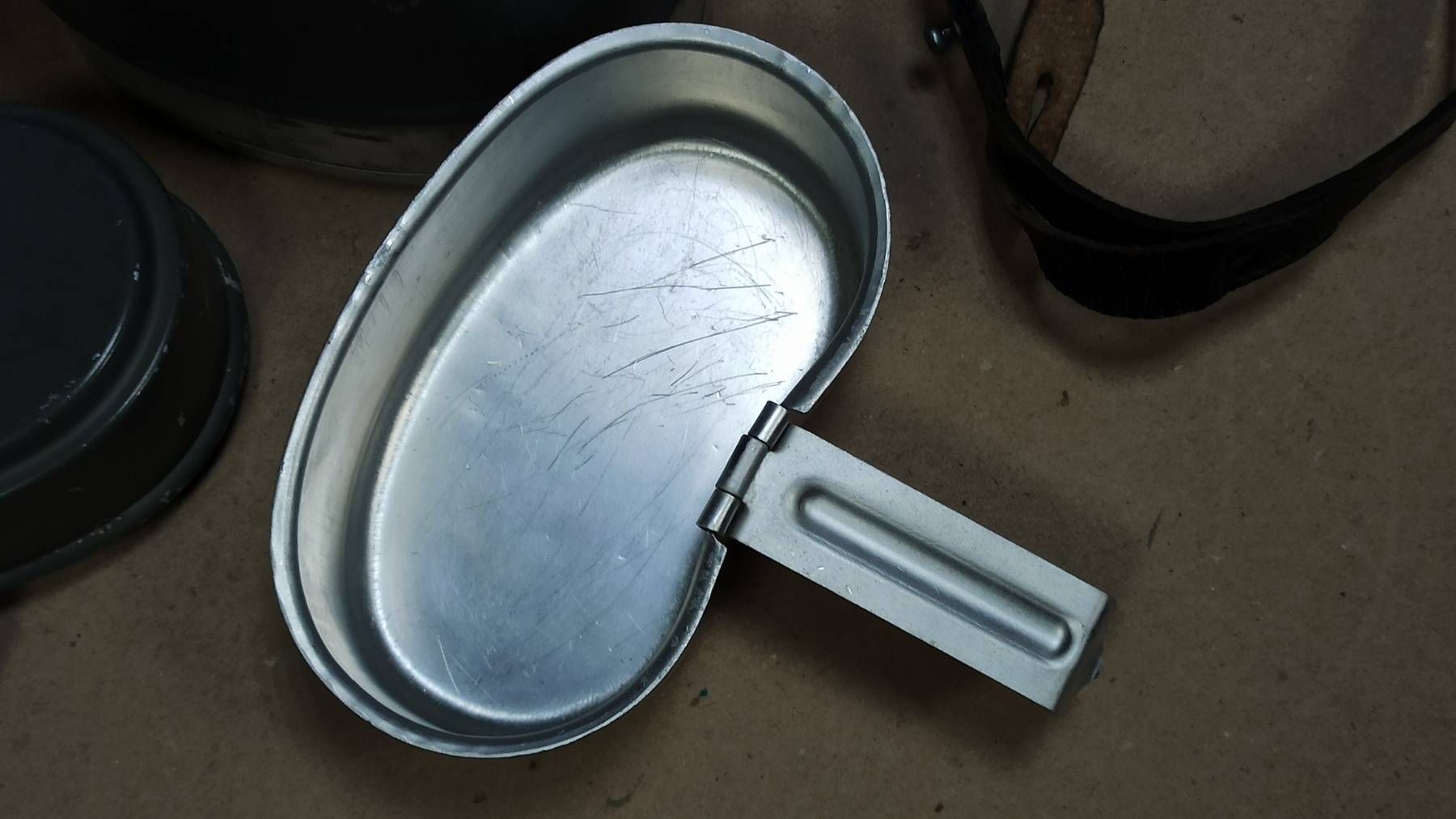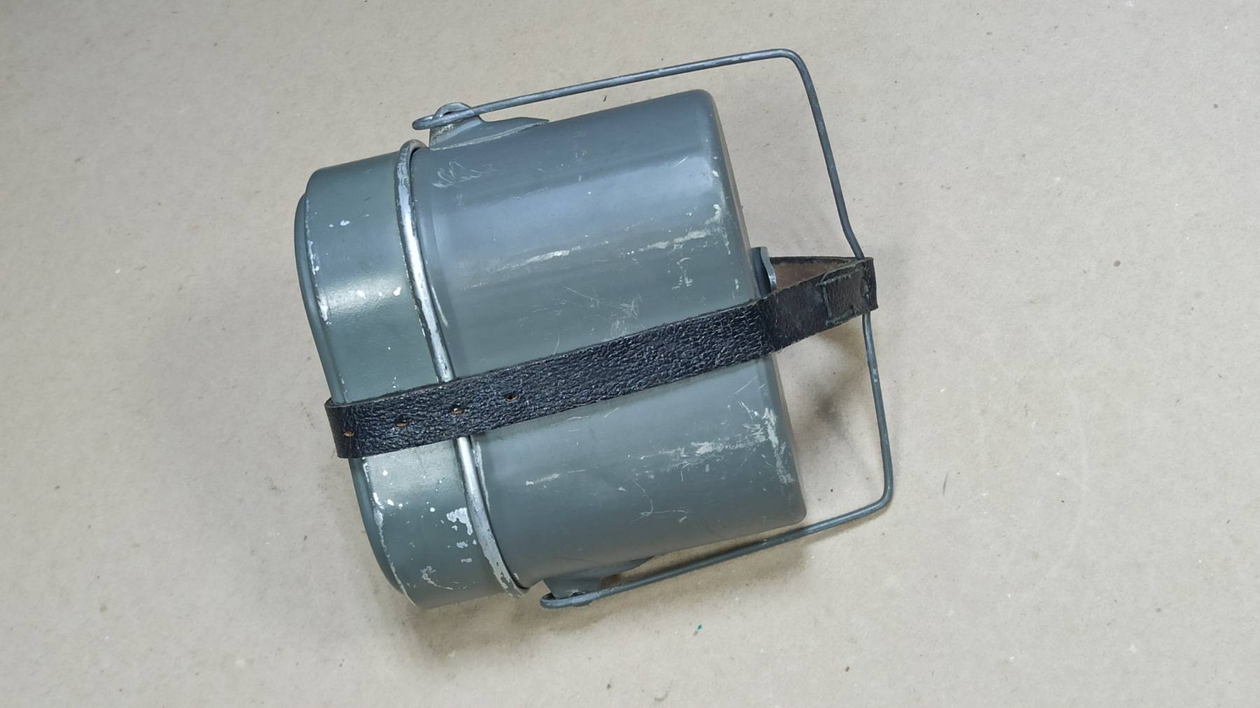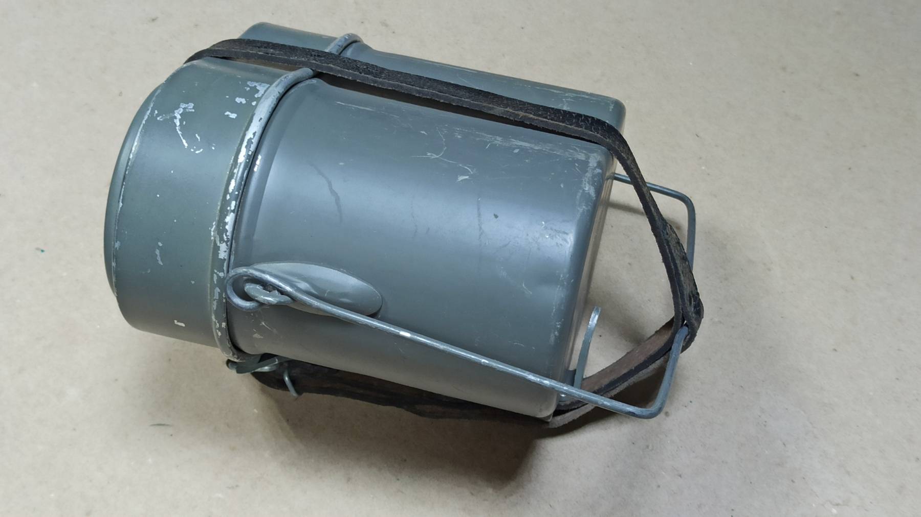 Оригинальный полевой котелок, ранней модификации, с кожаным ремешком для фиксации, Немецкой национальной народной армии, вооружённых сил ГДР. Образец снаряжения времен холодной войны, уже несуществующей армии и страны.