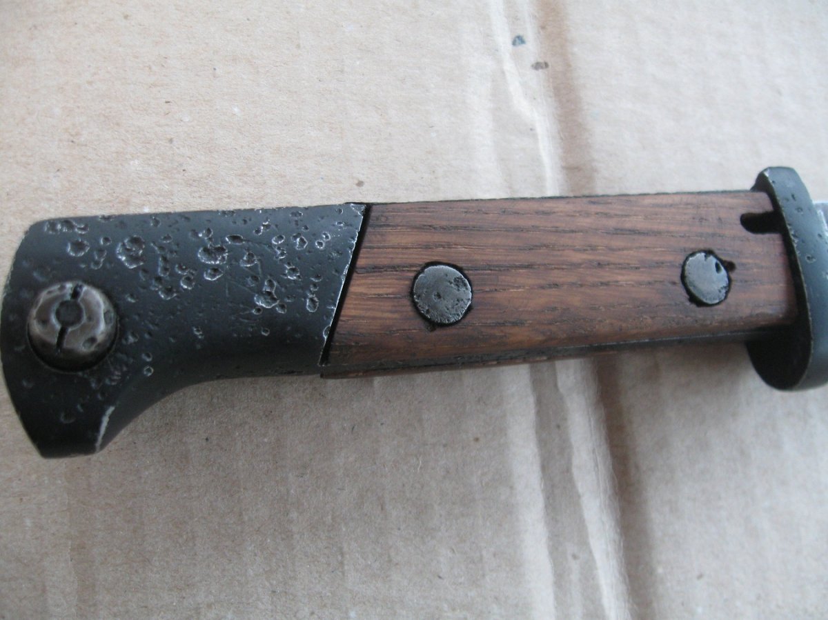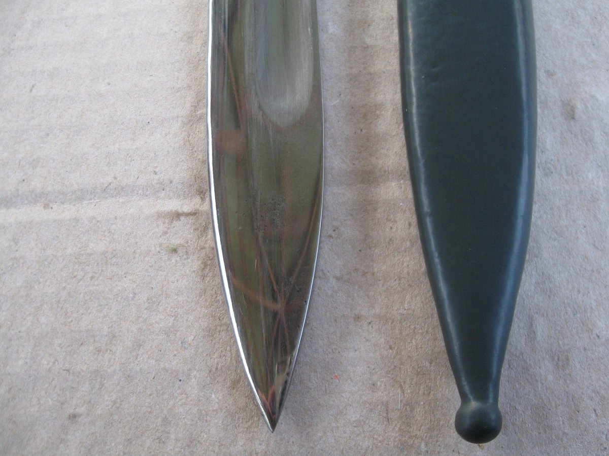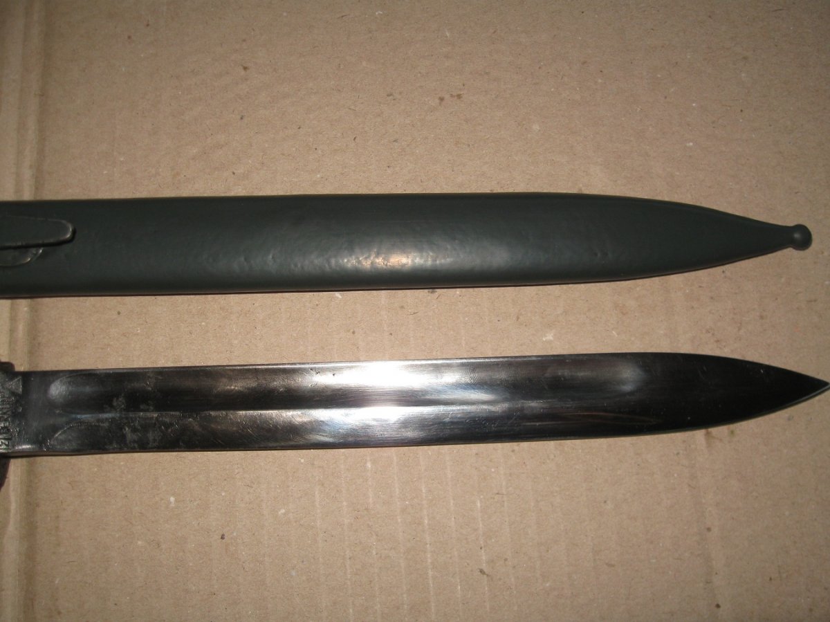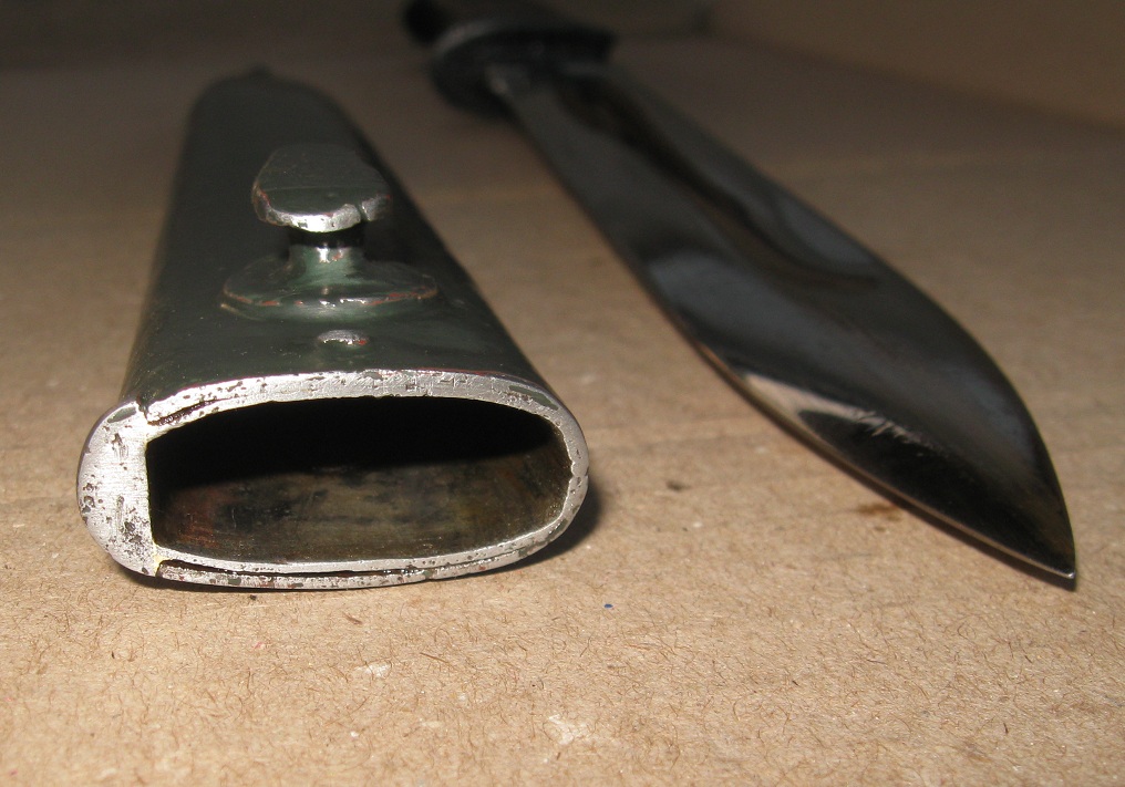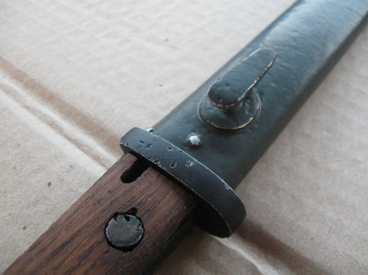 Ножны после реставрации, цвет подобран под исходник, пружина внутри отличная , клин держит оччень плотно, ш/н почищен, клин ровный, была в войну попытка заточить по кромке- острым не был. Всё родное за исключением накладок ( примитивный новодел). Кнопка и болтики всё робочее.