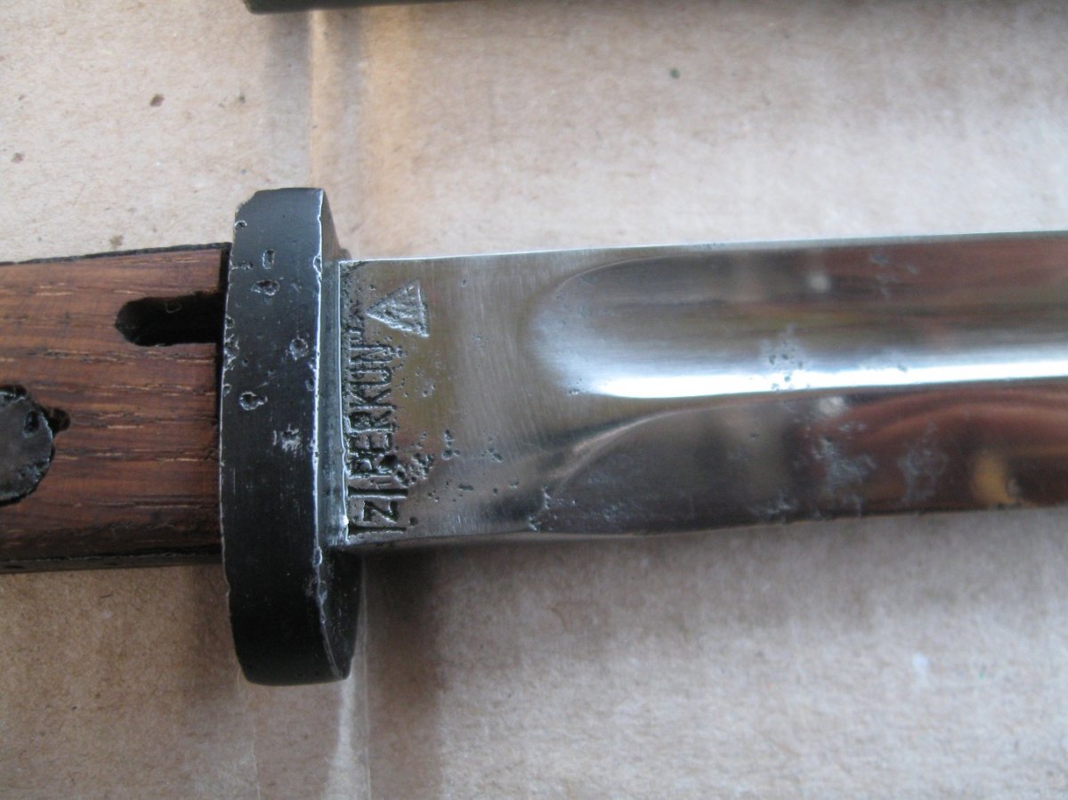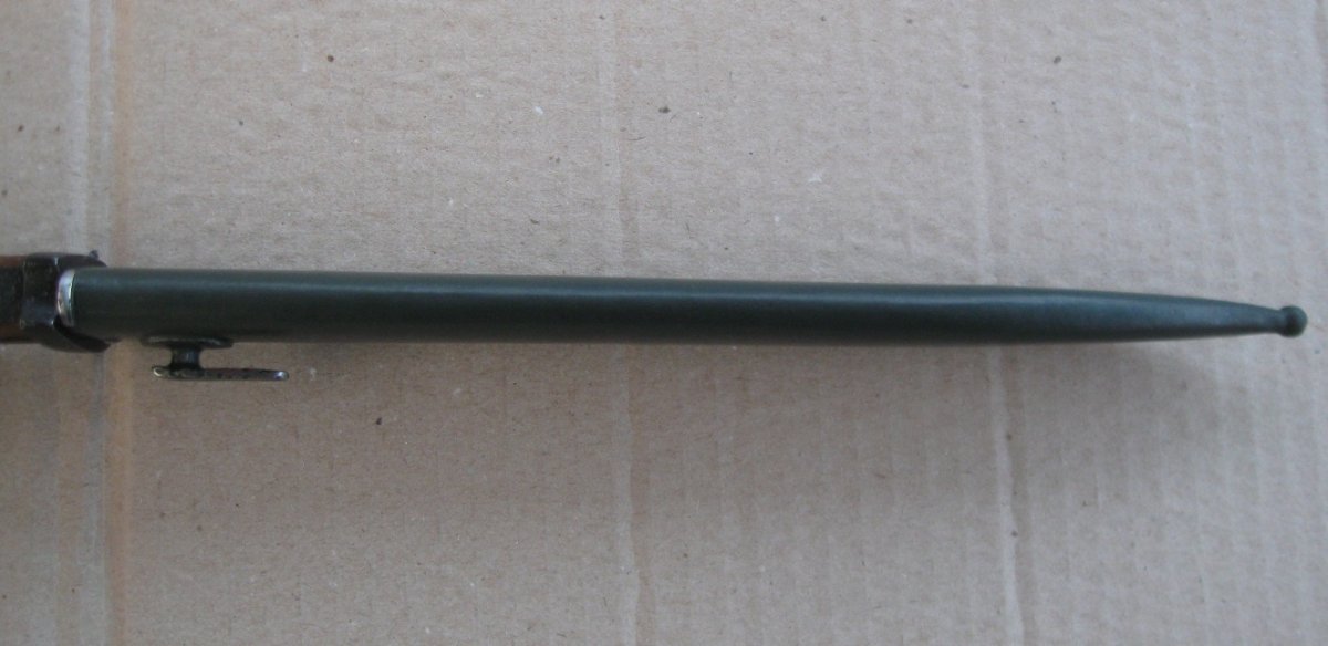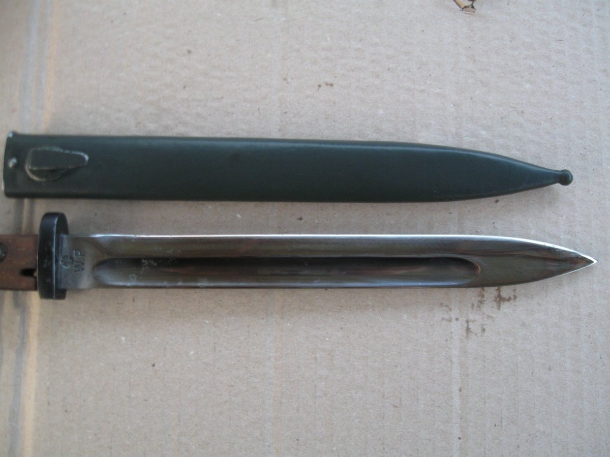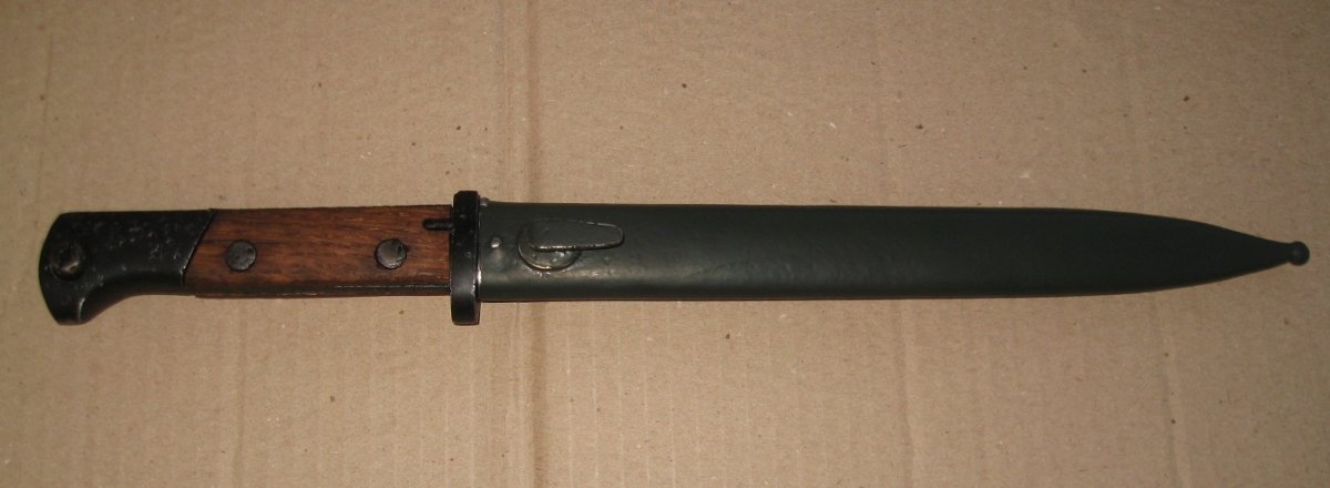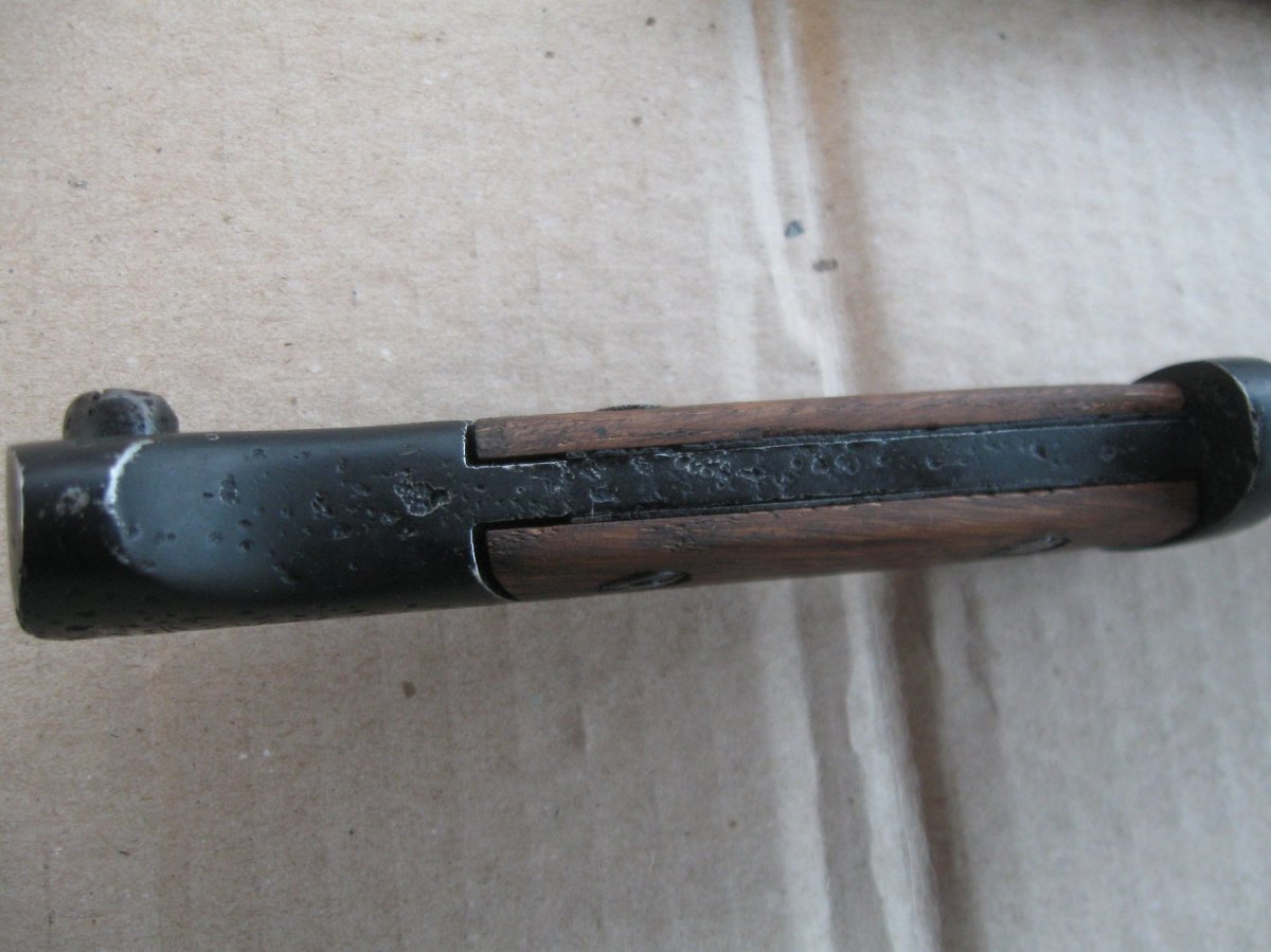 Ножны после реставрации, цвет подобран под исходник, пружина внутри отличная , клин держит оччень плотно, ш/н почищен, клин ровный, была в войну попытка заточить по кромке- острым не был. Всё родное за исключением накладок ( примитивный новодел). Кнопка и болтики всё робочее.