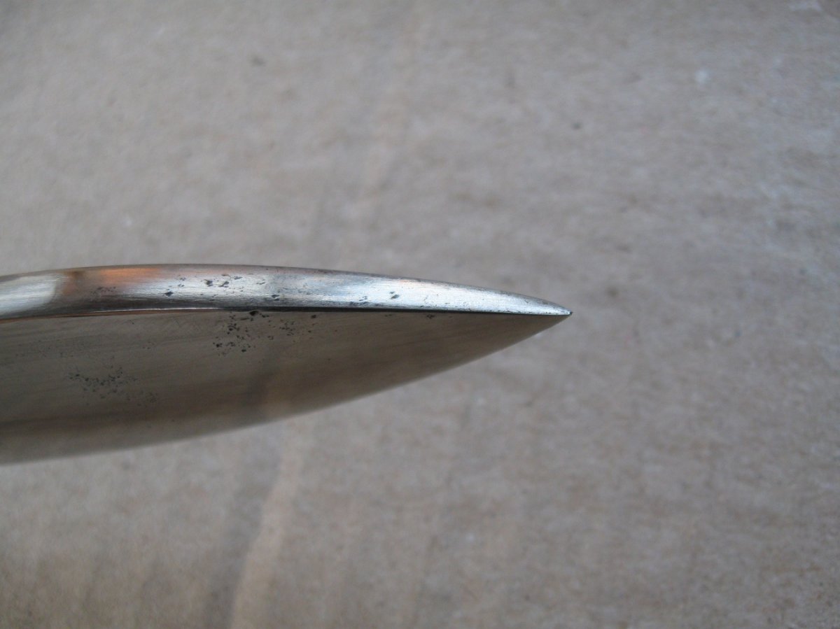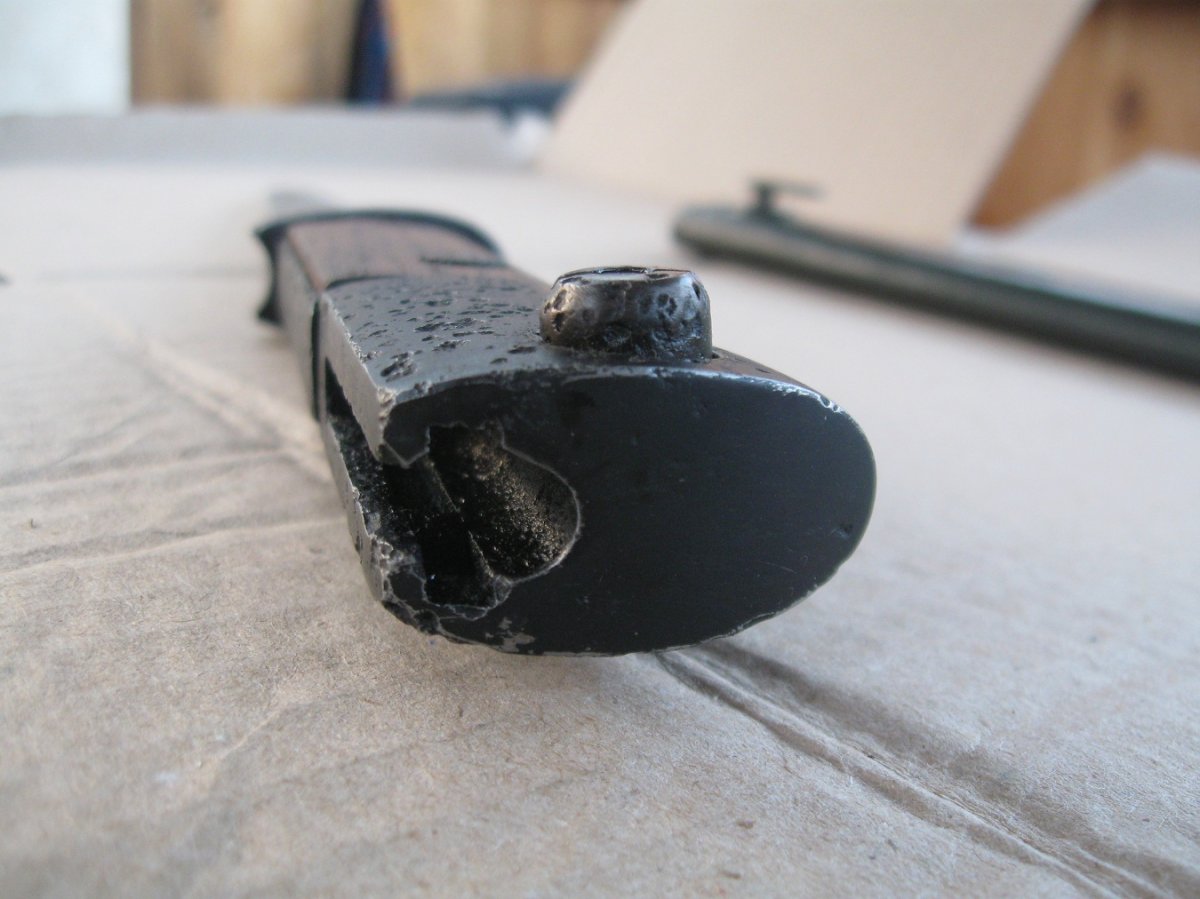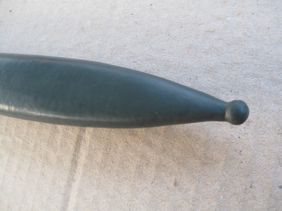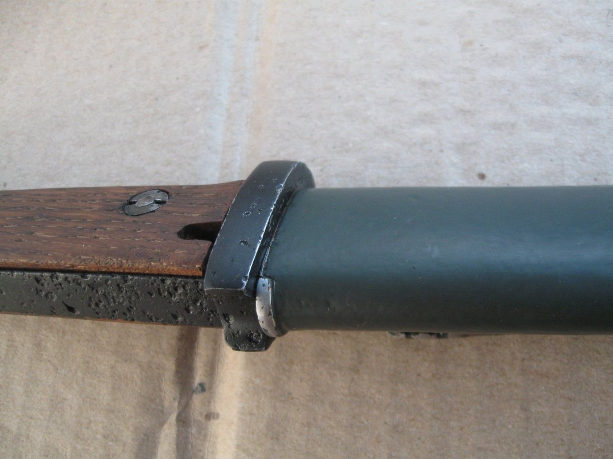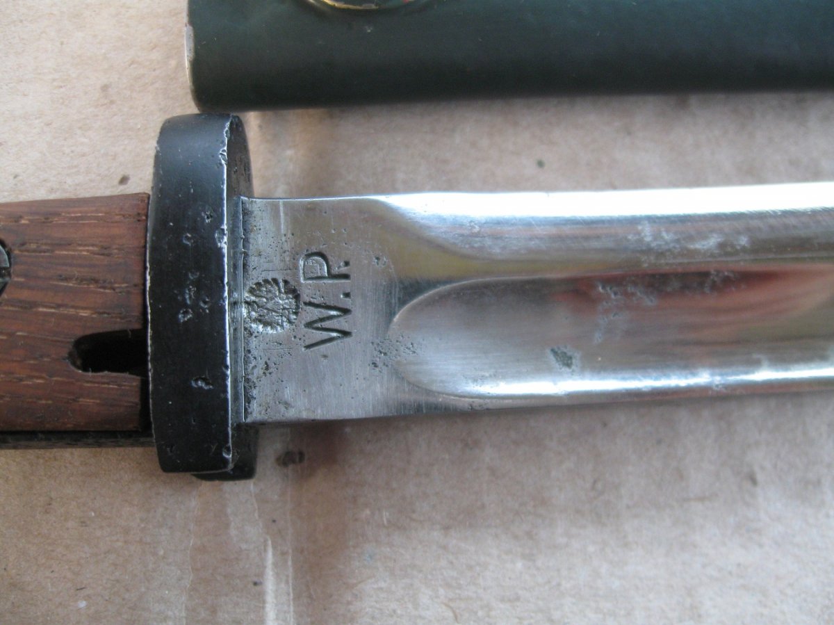 Ножны после реставрации, цвет подобран под исходник, пружина внутри отличная , клин держит оччень плотно, ш/н почищен, клин ровный, была в войну попытка заточить по кромке- острым не был. Всё родное за исключением накладок ( примитивный новодел). Кнопка и болтики всё робочее.