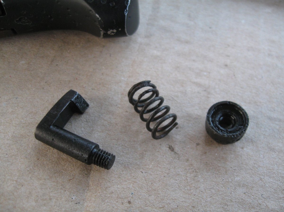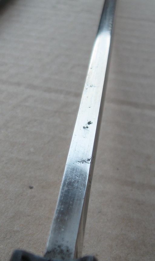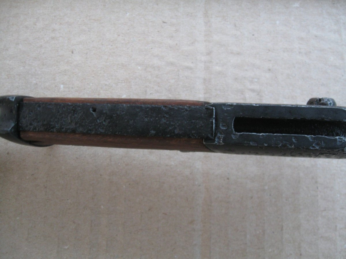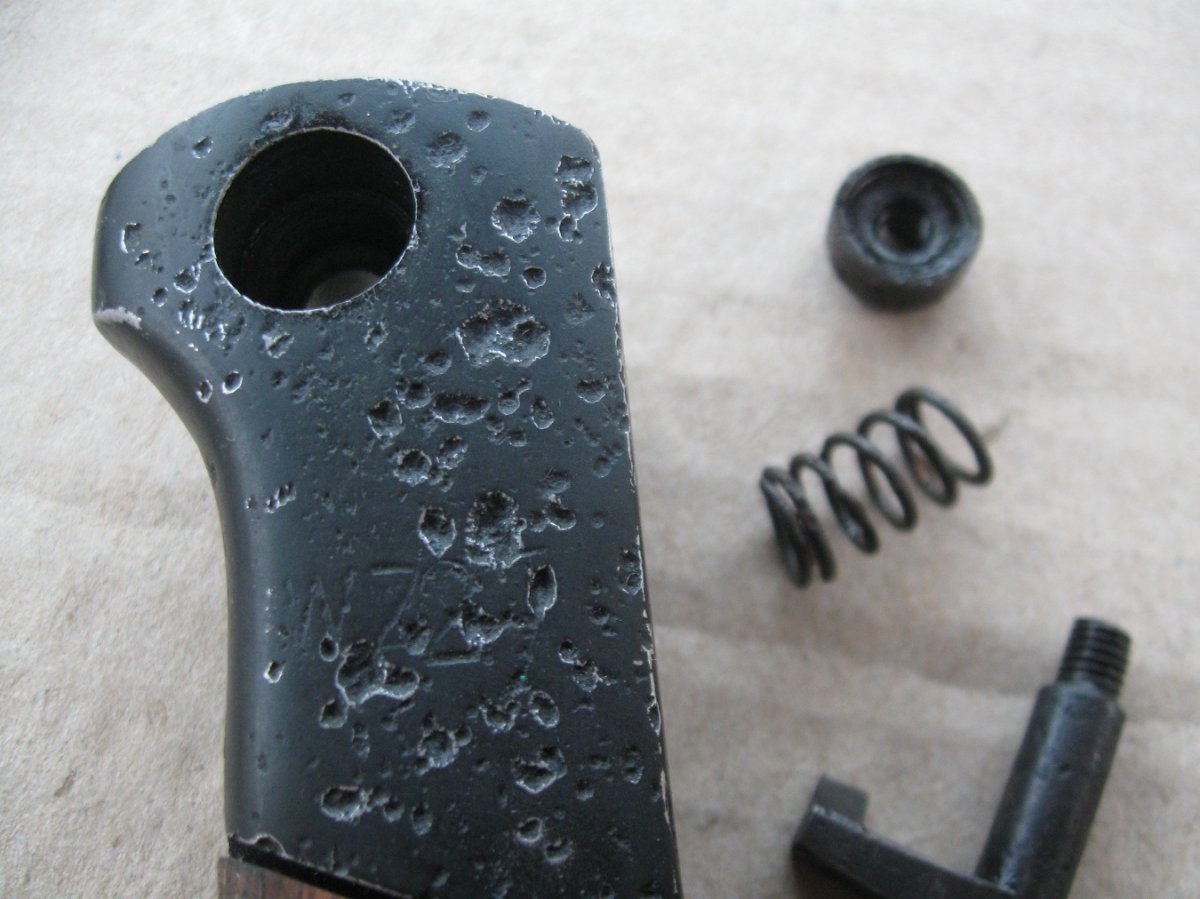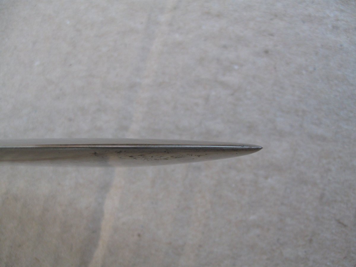 Ножны после реставрации, цвет подобран под исходник, пружина внутри отличная , клин держит оччень плотно, ш/н почищен, клин ровный, была в войну попытка заточить по кромке- острым не был. Всё родное за исключением накладок ( примитивный новодел). Кнопка и болтики всё робочее.