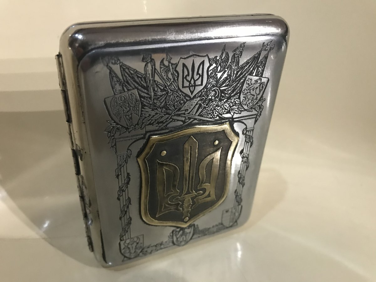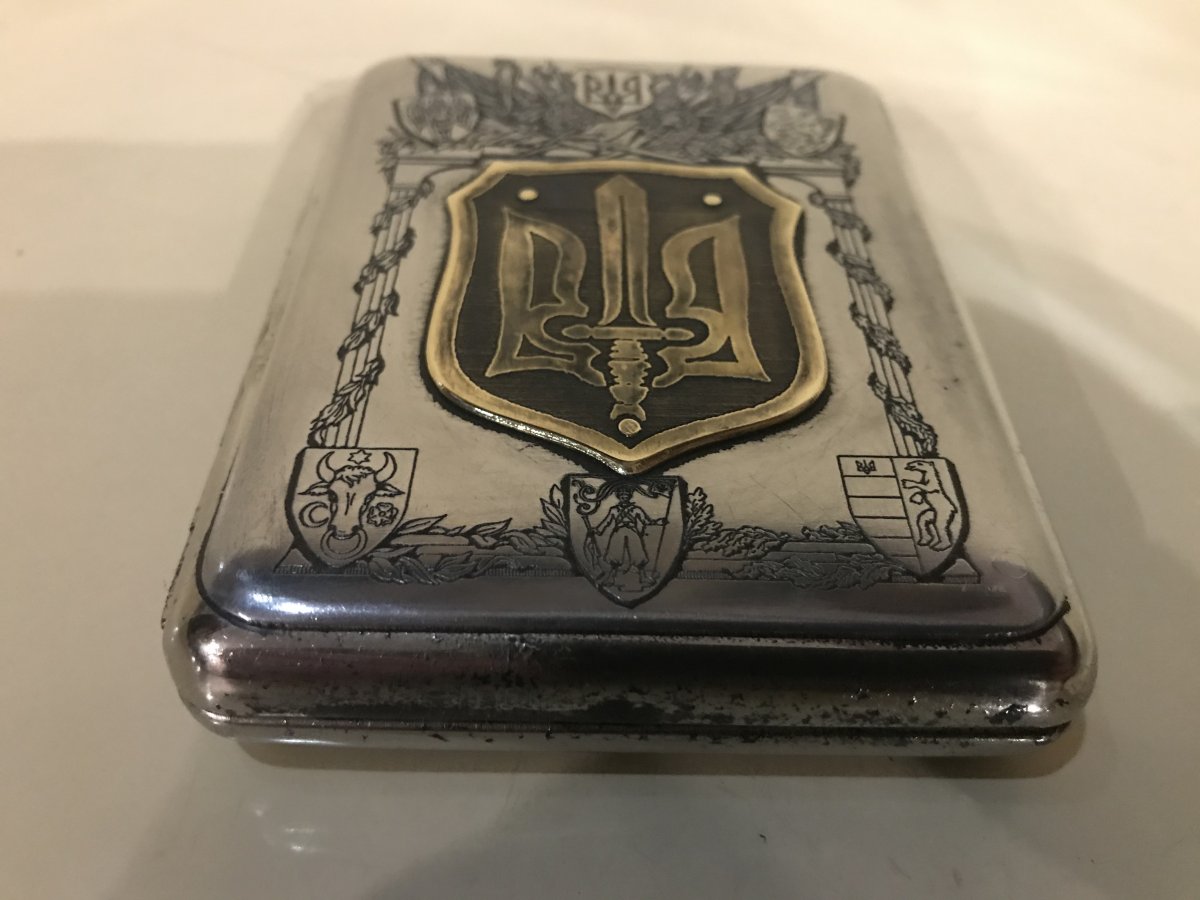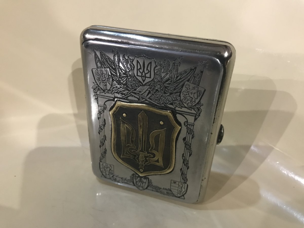 Портсигар на тему других національно визвольних змагань - УПА. Малюнок та напис -гравіювання. Тризуб накладний.