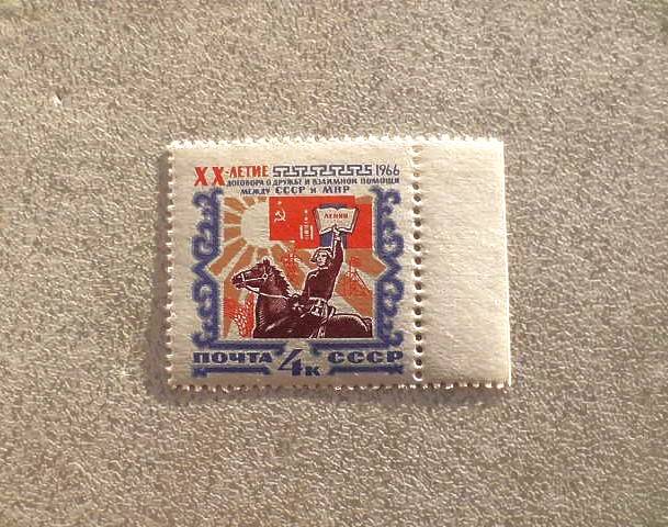 Поштова марка СРСР " 20 років Договору про дружбу і взаємну допомогу між СРСР і МНР " 1966 рік **