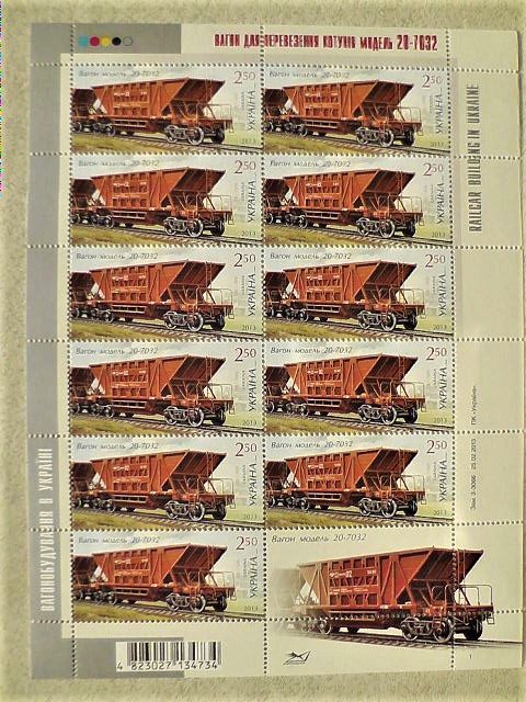 Поштовий аркуш марок " Вагонобудування в Україні вагон для перевезення котунів модель 20 - 7032 "