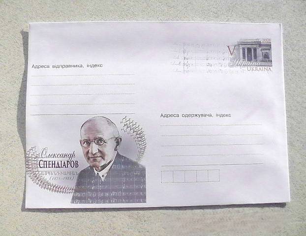 Маркований конверт, який був введений в обіг 18 жовтня 2021 року, присвячено 150-річчю від дня народження видатного вірменського композитора та диригента Олександра Спендіарова. Уродженець невеличкого українського міста Каховка став одним з основоположників вірменської класичної музики. Два музичні твори — сюїта «Кримський ескіз» і симфонічна картинка «Три пальми» принесли композитору широку популярність. Серед найкращих творів: чудовий зразок національного симфонізму «Єреванські етюди» (1925) і опера «Алмаст» (1928), створені в останні роки життя.