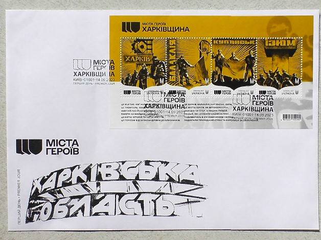 КПП конверт першого дня з блоком марок та спецпогашенням "Міста Героїв. Харківщина"