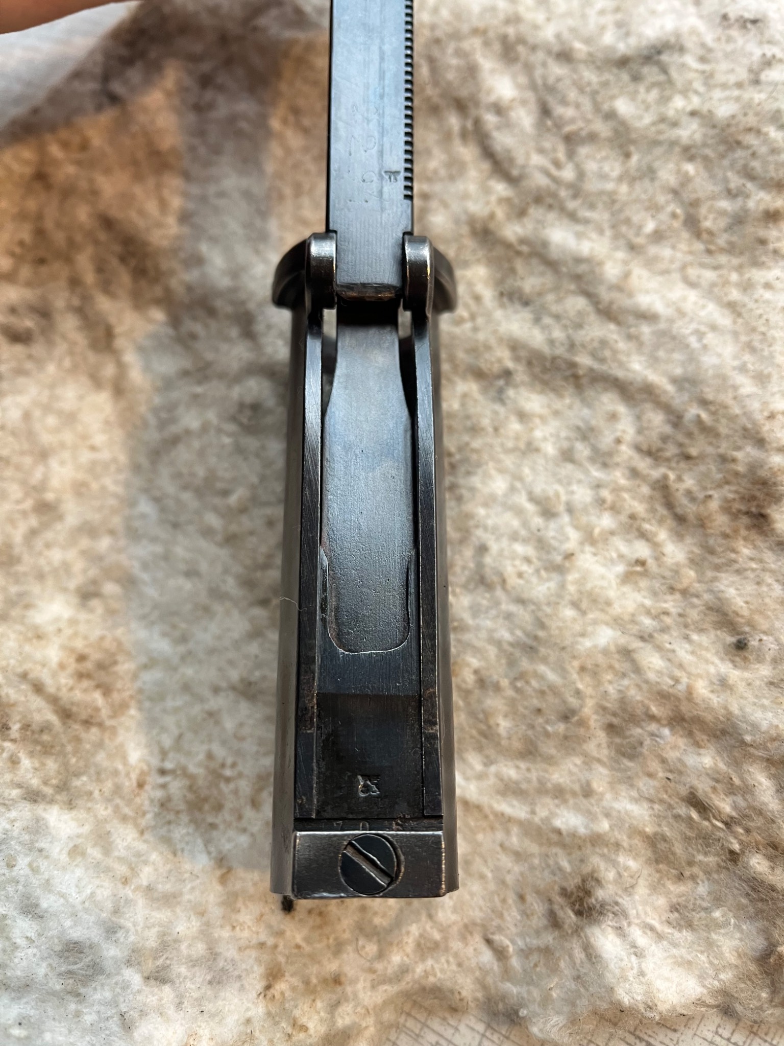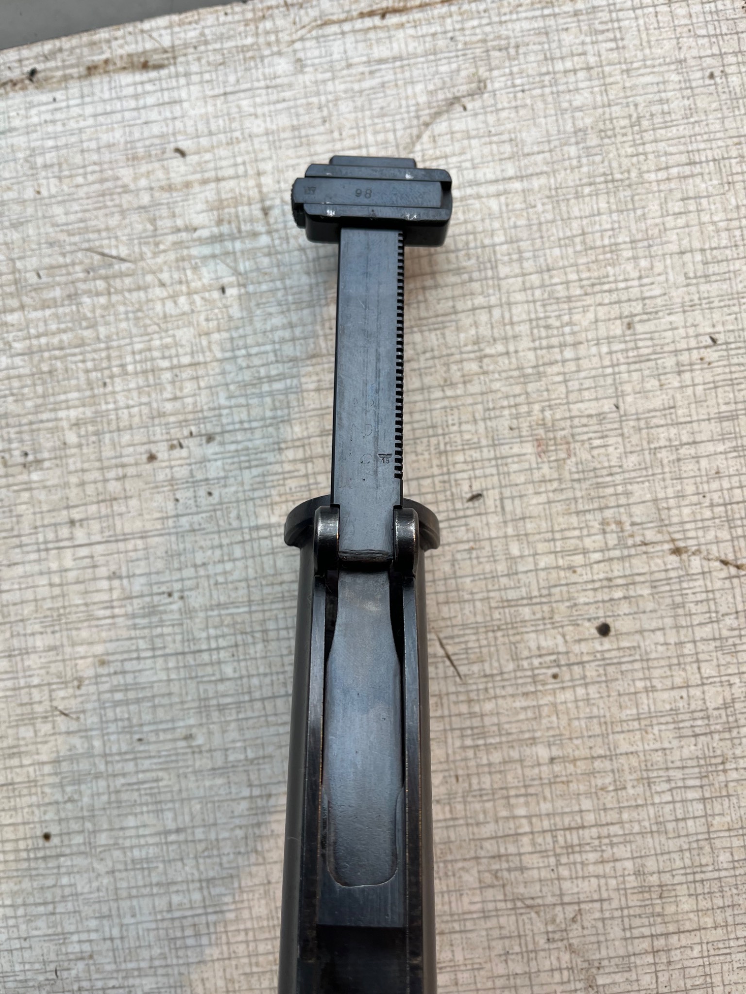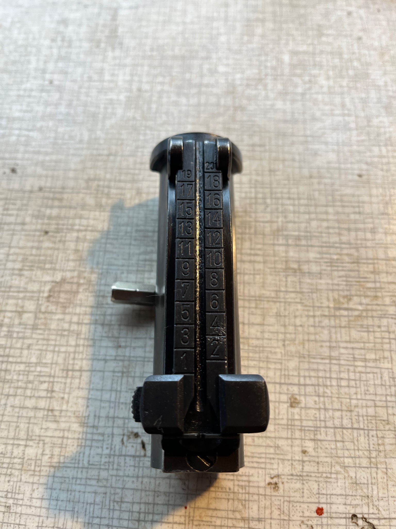 Пропоную Вашій увазі задні прицільні засоби у зборі до німецької гвинтівки Mauser 98k. Прицільна планка із поділками тільки з одного боку (середина - кінець війни). Стан - склад, але присутні дрібні потертості/подряпини вороніння