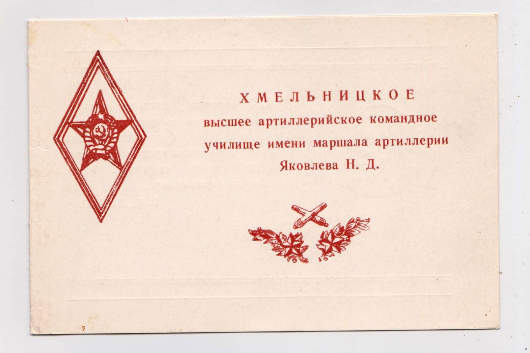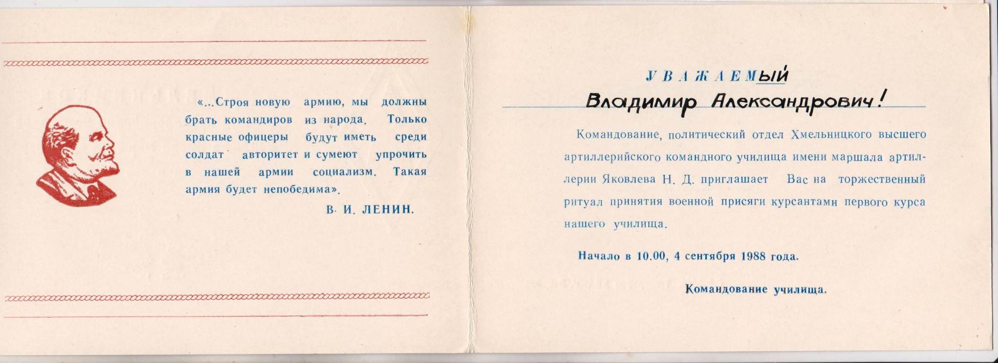 Приглашение на принятие военной присяги = Хмельницкое высшее артиллерийское училище = 1988 р.
