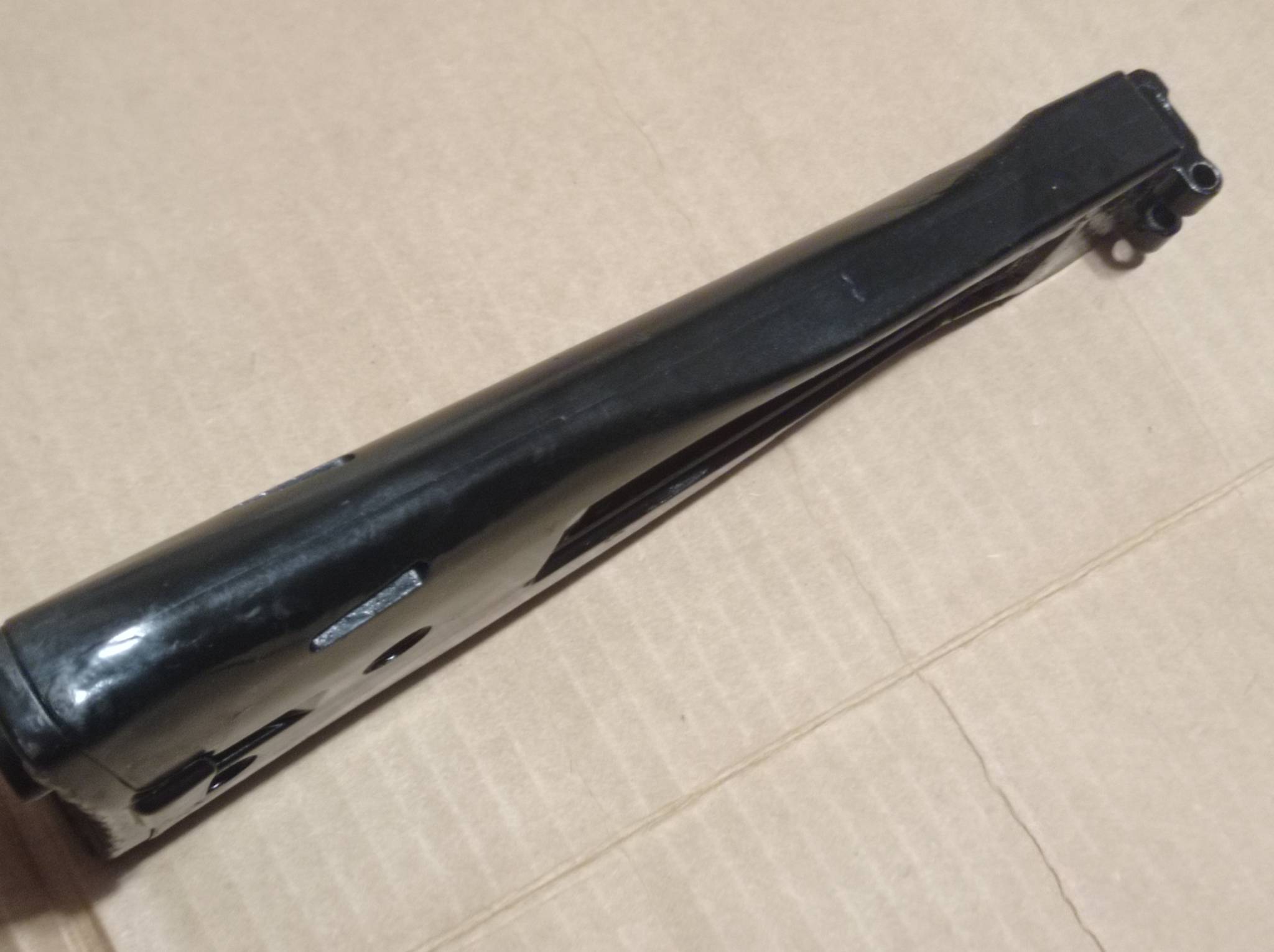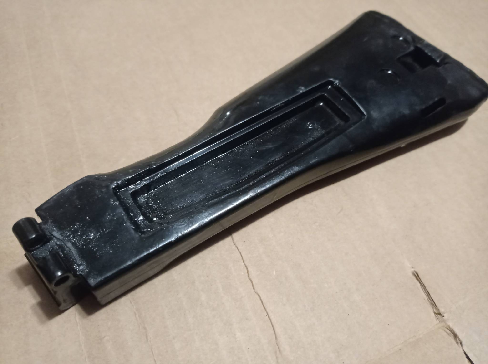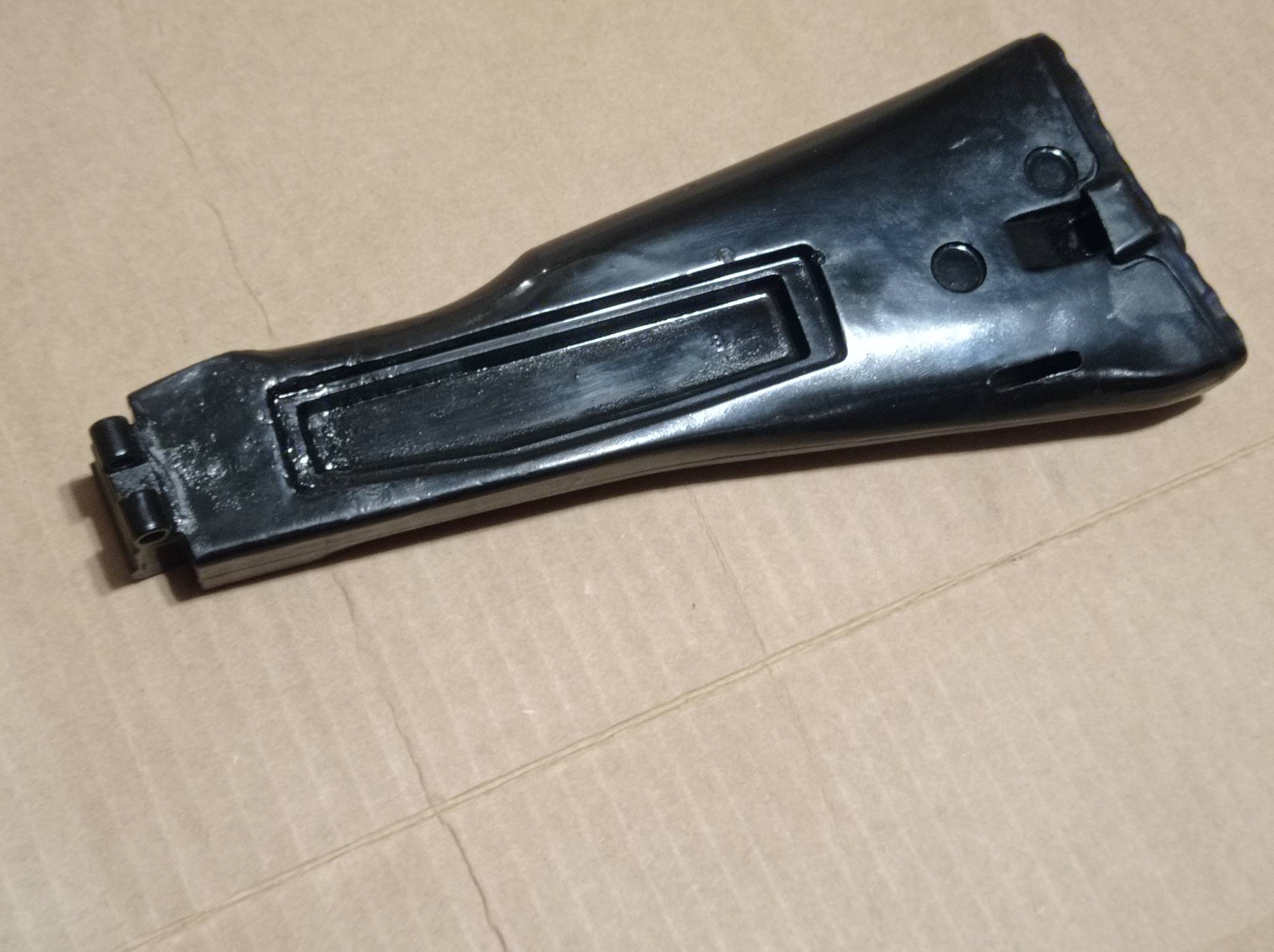 Відремонтований приклад до АК 74 м. Було влучання осколку. Відновлено надійно,запаяно тріщини та пофарбовано,кріплення під широку вісь. Пружина пенала на місці,застібка працює. Пружини справні.. По кріпленню також підходить до АК 12.
