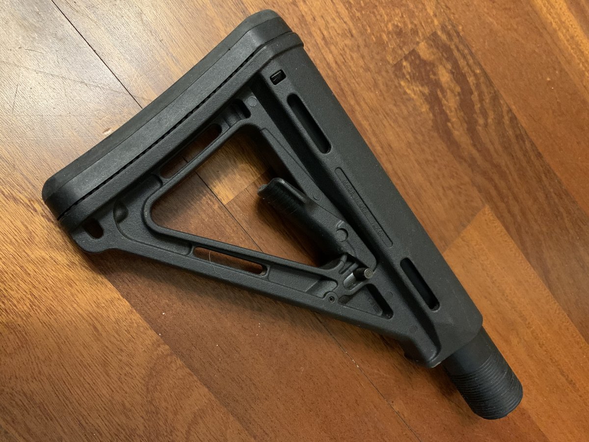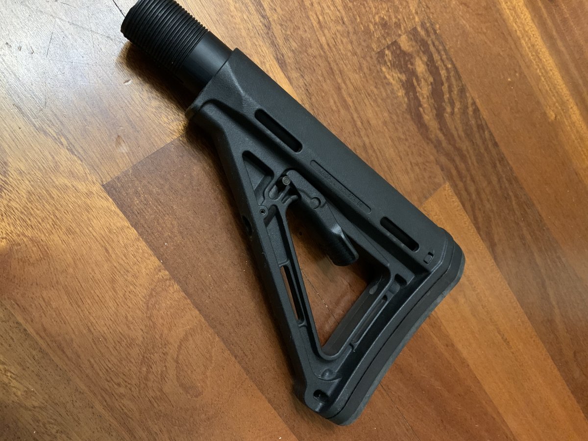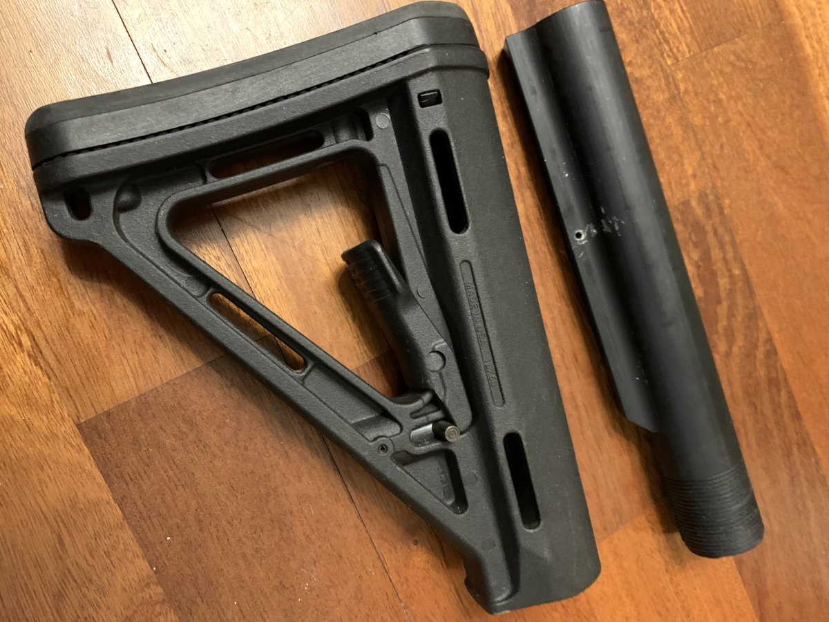 Под коммерческую трубу (в комплекте), приклад б/у в очень хорошем состоянии, на трубе есть отверстие для штифта фиксатора в самом выдвинутом положении, в других положениях его не видно.
