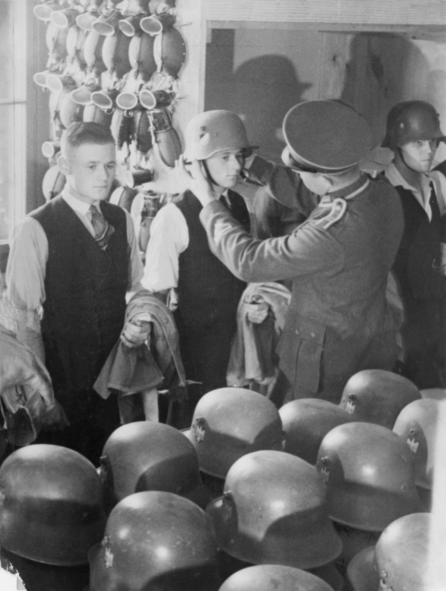 Призывники вермахта примеряют выданное обмундирование.