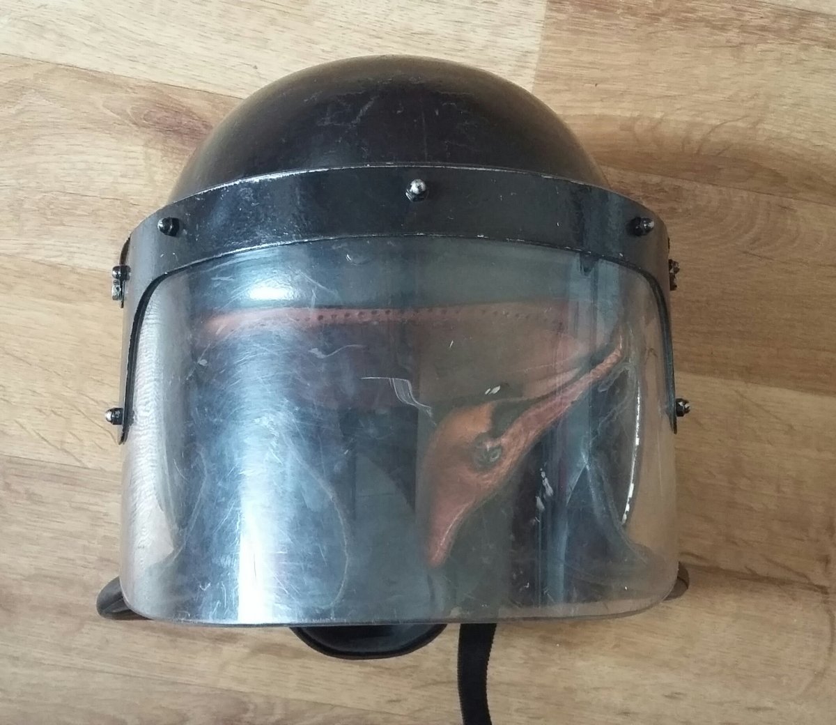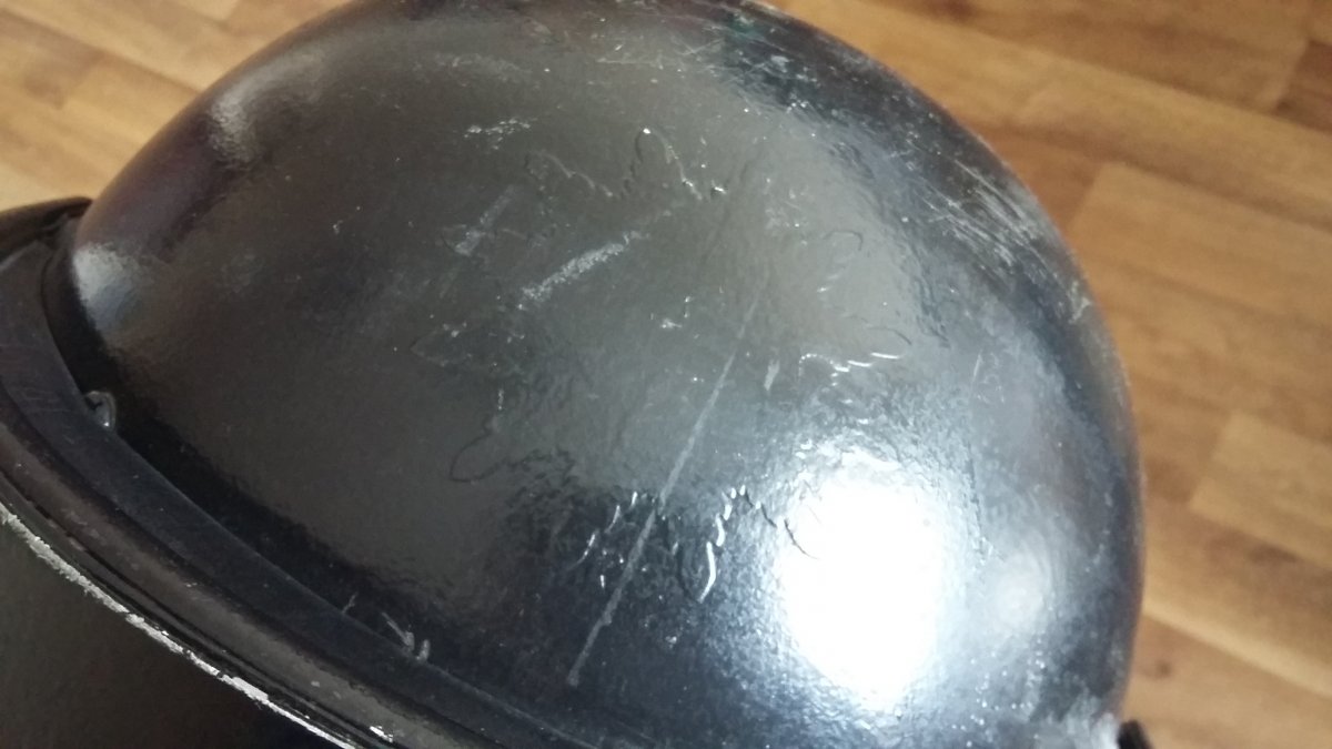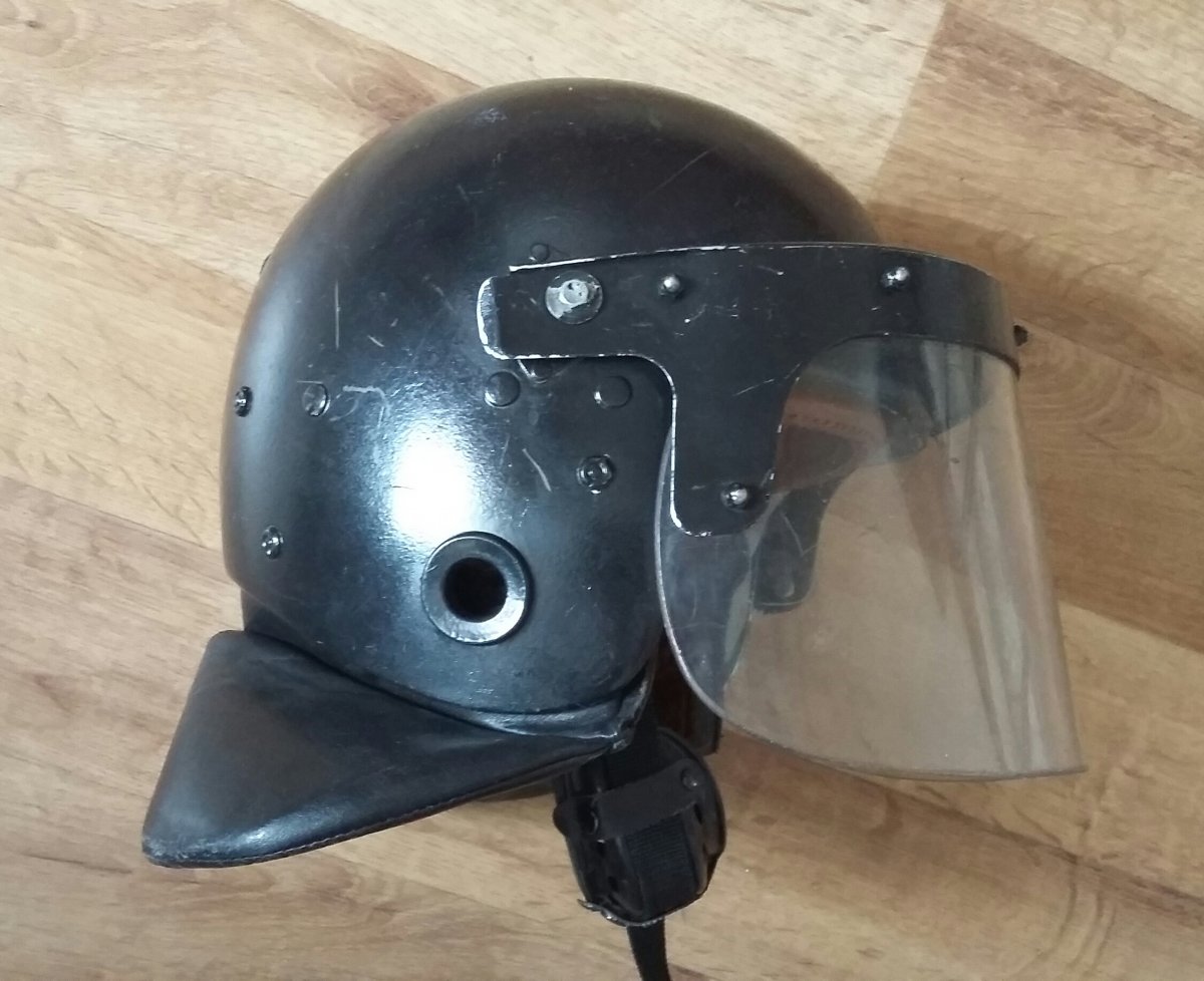 Противоударный шлем немецкой полиции, состояние б/у, есть потертости, целый, трещин, ударов нет. Был перекрашен в черный цвет, под краской просматривается эмблема полиции. Размер 56-58. Подшлемник и бармица кожаные, кожа мягкая, не затаскан.
