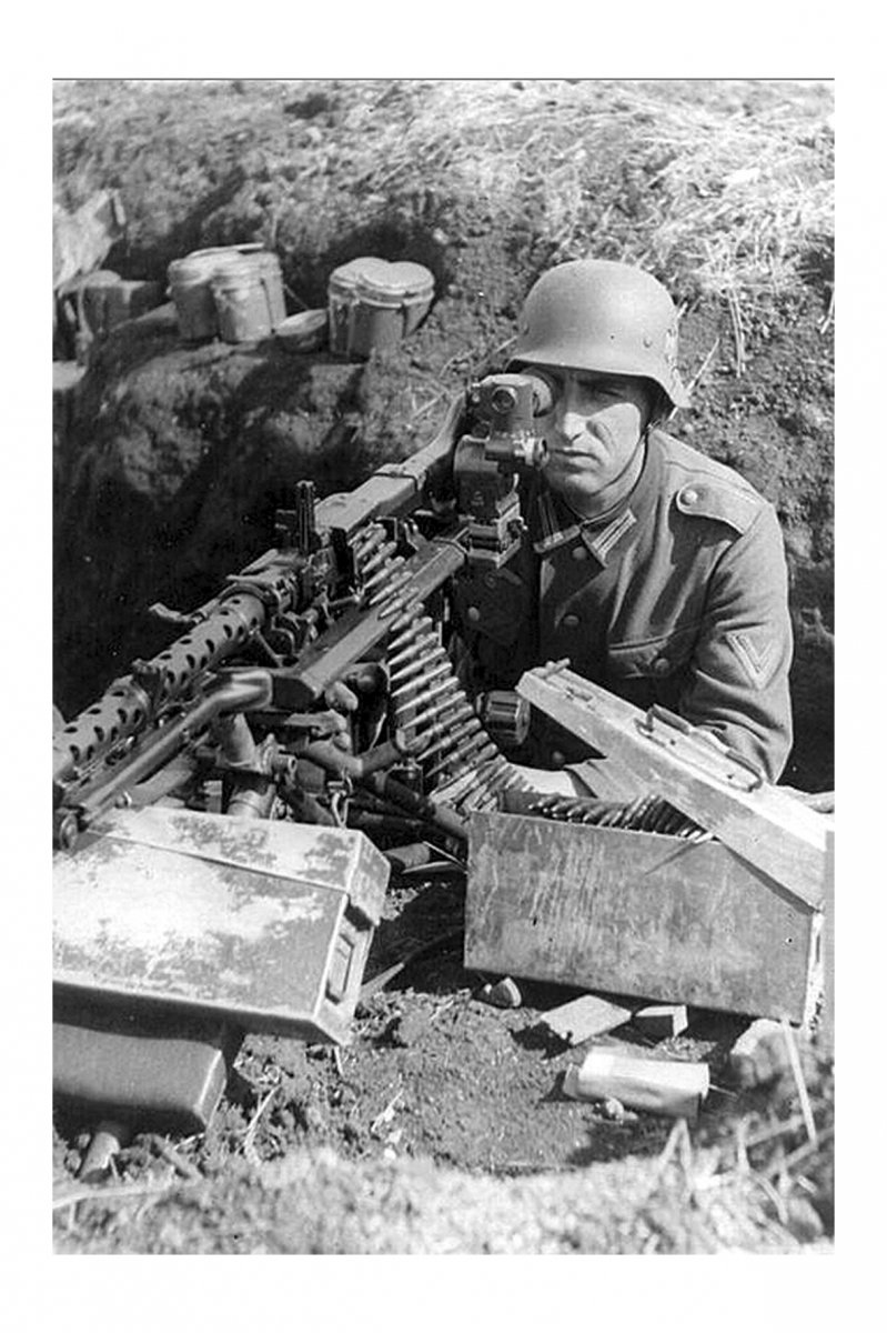 Пулемётчик вермахта в окопе смотрит в оптический прицел.