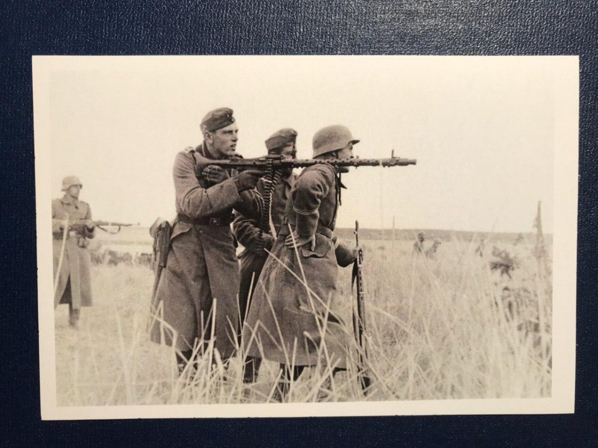 Пулемётчик вермахта ведёт огонь с плеча другого солдата.