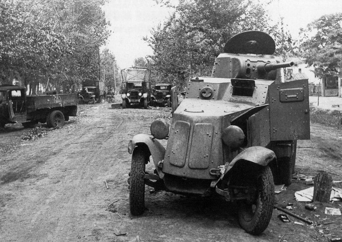 Разбитая техника РККА. На переднем плане бронеавтомобиль БА 10.