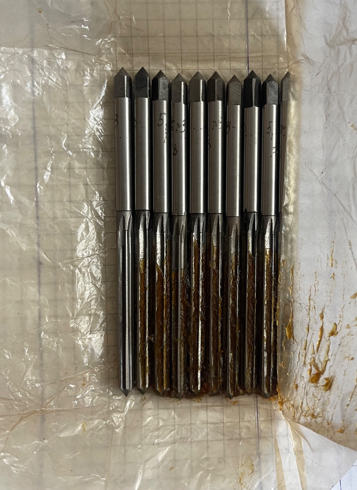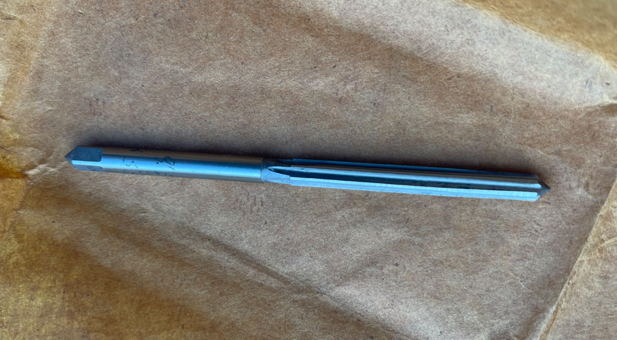 Цилиндрическая развертка Ф5,5мм. изготовлена из самого прочного и износоустойчіивого материала - инструментальной быстрорежущей стали «Р-18», (самокал, рапид), потом уже шли «Р-12», «Р-9», «Р6М5»….. … ну а соврєменная«9ХС»в конце етого списка). Новая в работе не была, судя по маркировке электрокарандашом, выпускалась для внутренних потреб завода, в лоте - 1шт.)