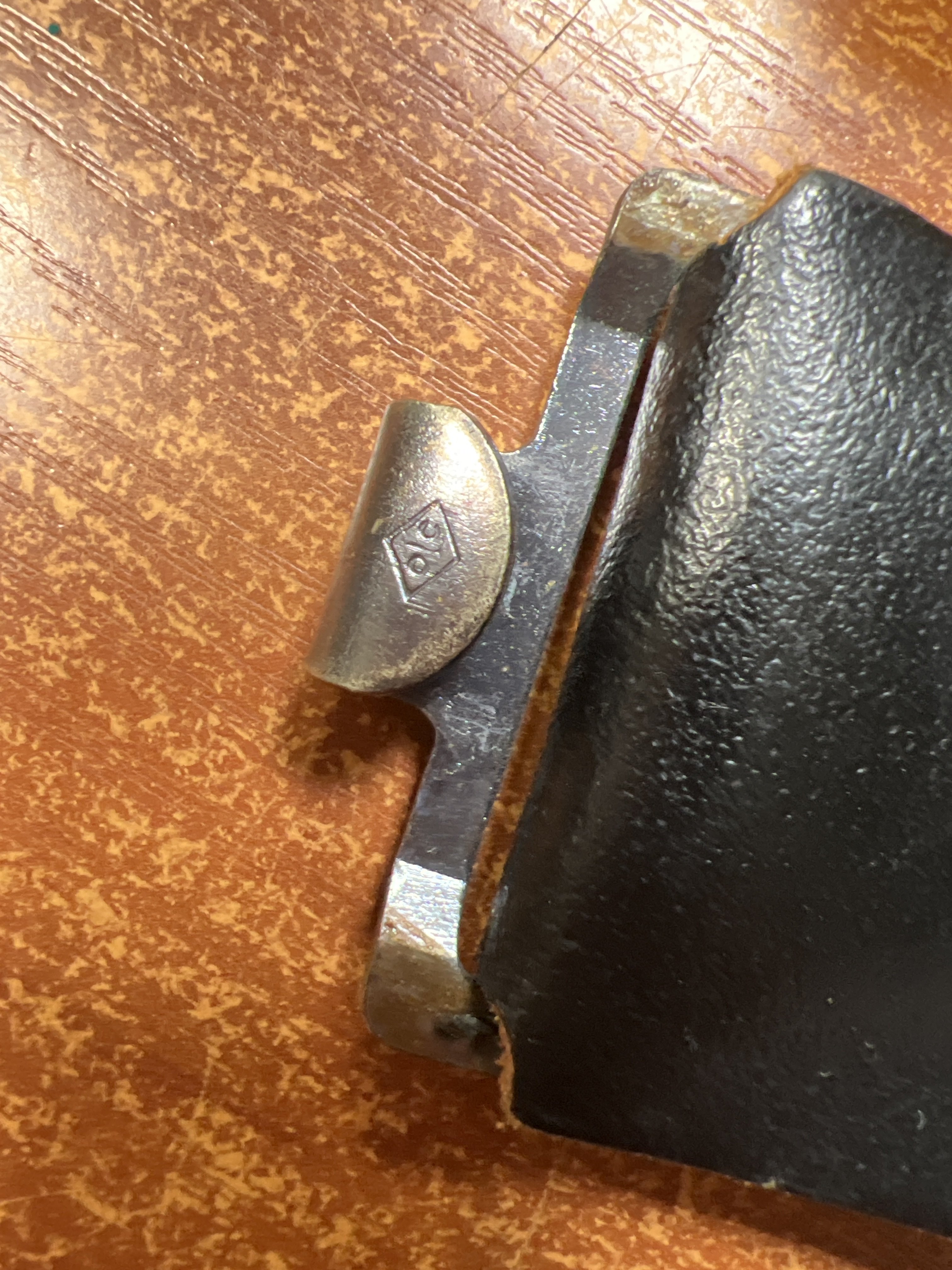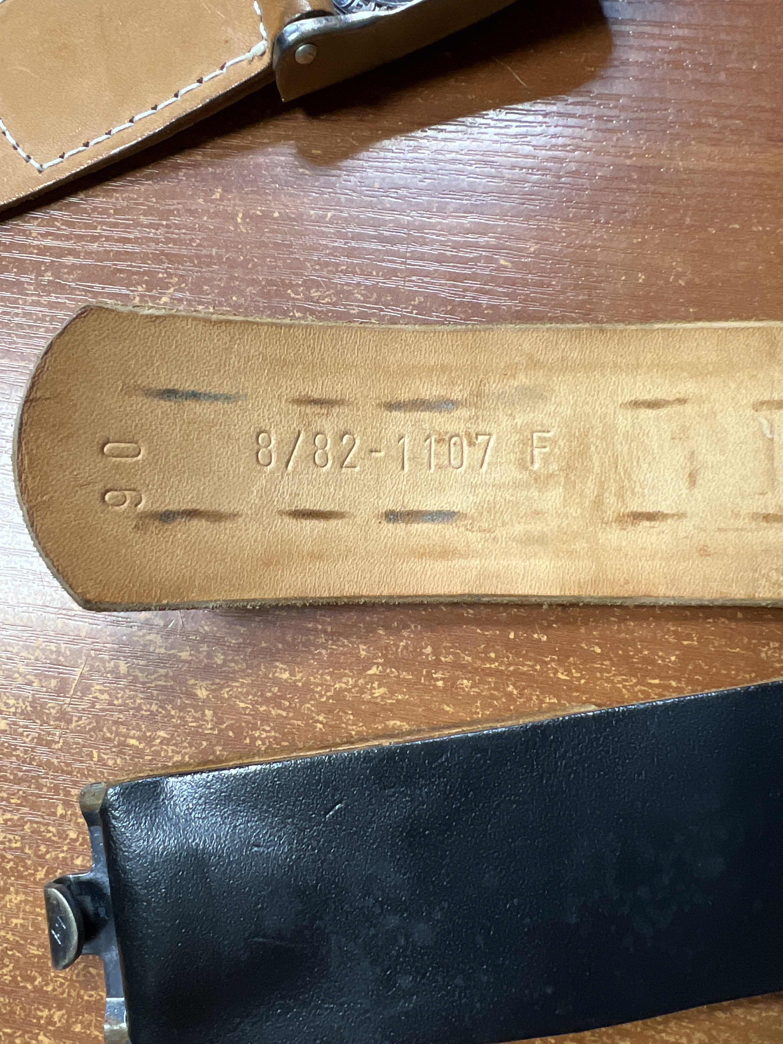 - На обратной стороне пряжки с правой стороны есть два держателя (зубцы) для крепления к ремню, и защелка (скоба) - с левой стороны, с дополнительным кожаным хлястиком.
