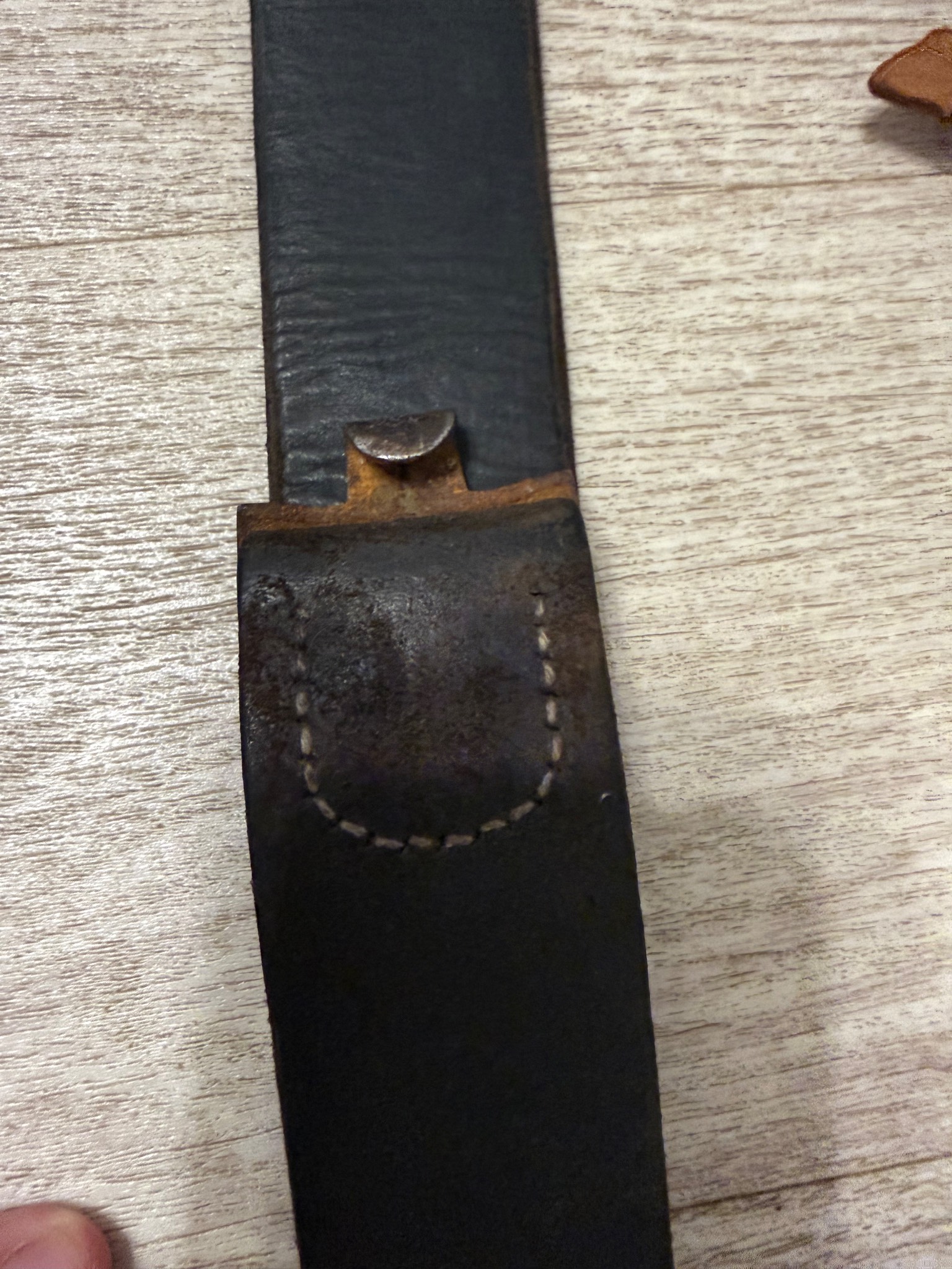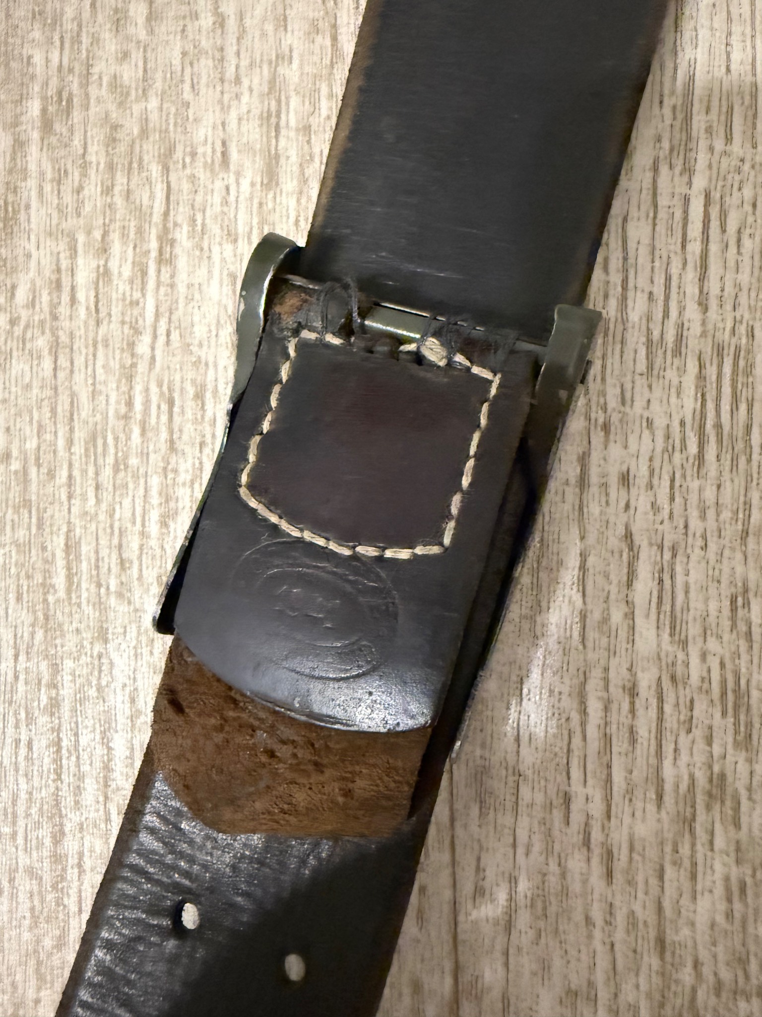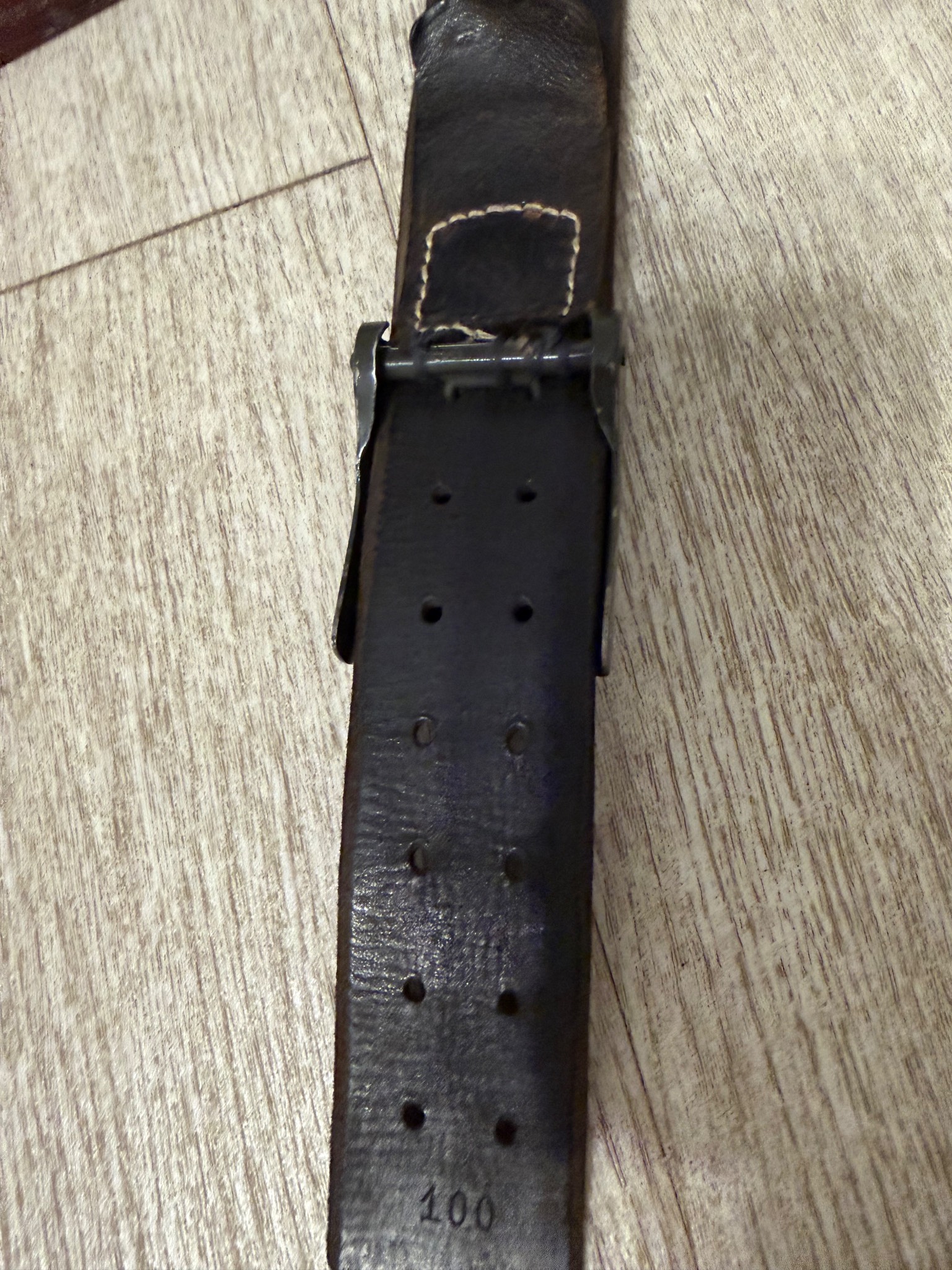 Ремень в хорошем состоянии. Кожа не сухая , сохранена оригинальная прошивка . Попался ремень в такой комплектации в которой есть . Единственное, пришил как мог хлястик к пряге , так как от использования он окончательно потрескался . Все на клеймах