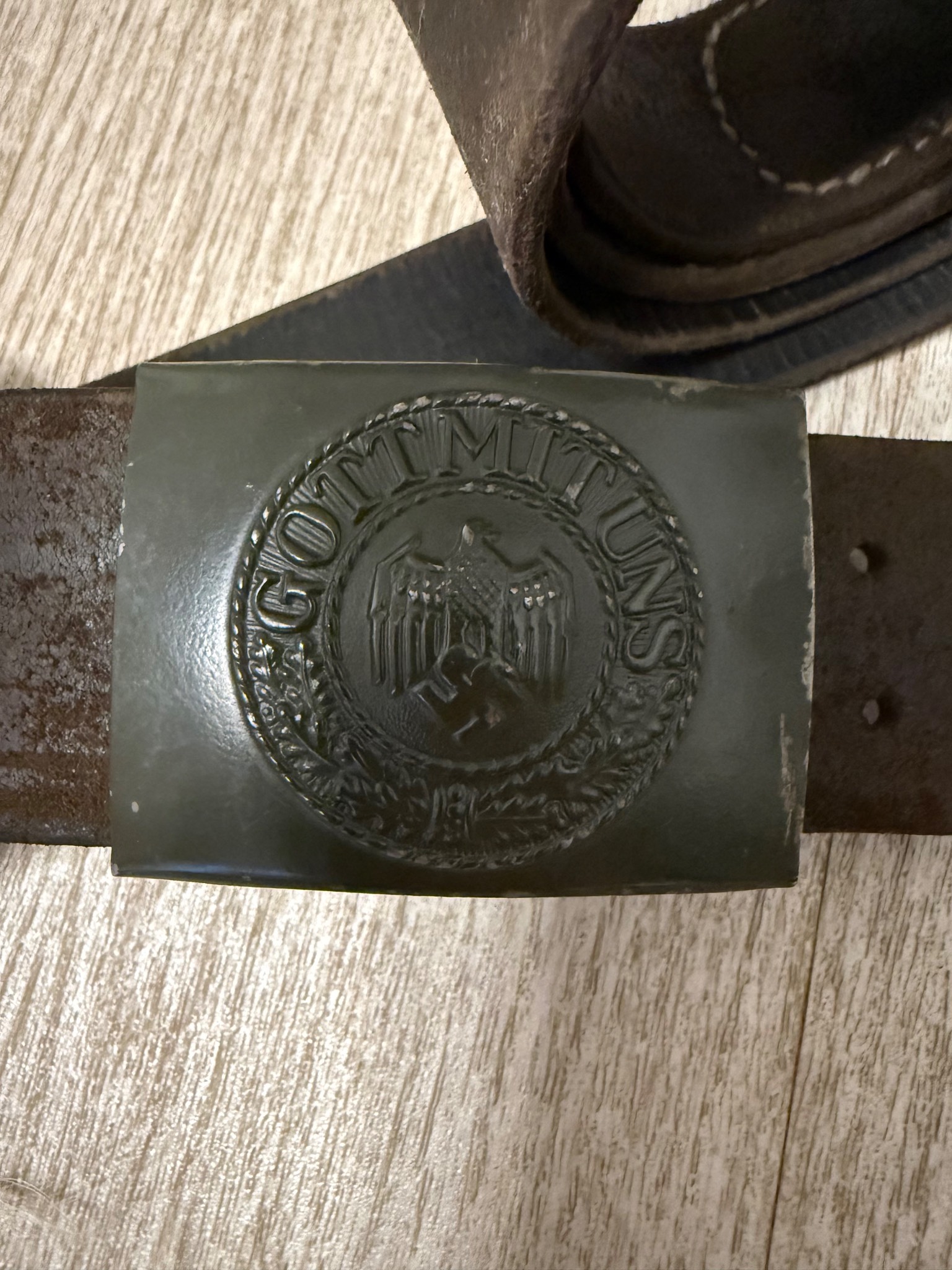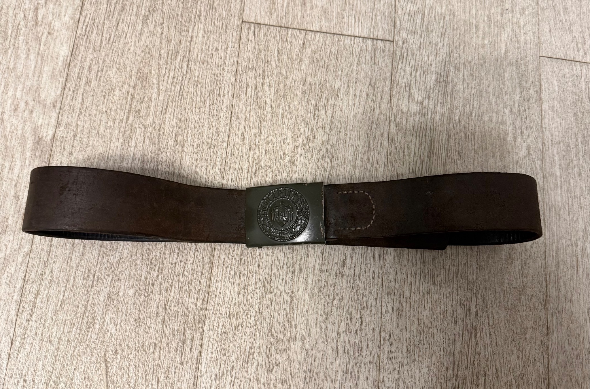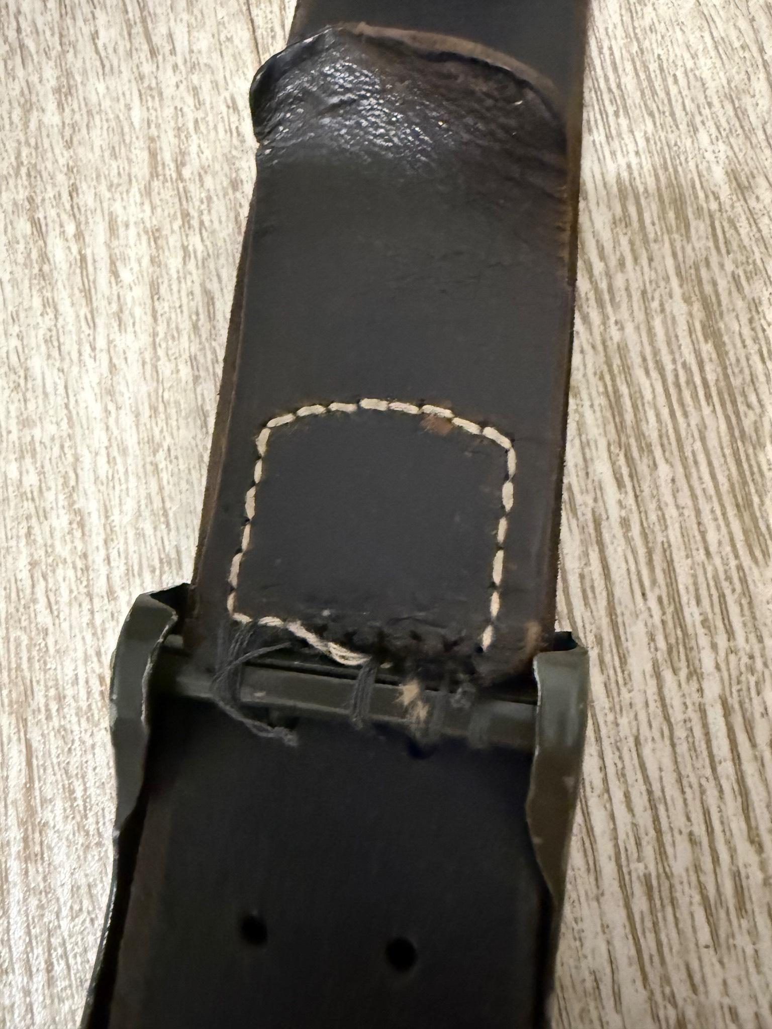 Ремень в хорошем состоянии. Кожа не сухая , сохранена оригинальная прошивка . Попался ремень в такой комплектации в которой есть . Единственное, пришил как мог хлястик к пряге , так как от использования он окончательно потрескался . Все на клеймах