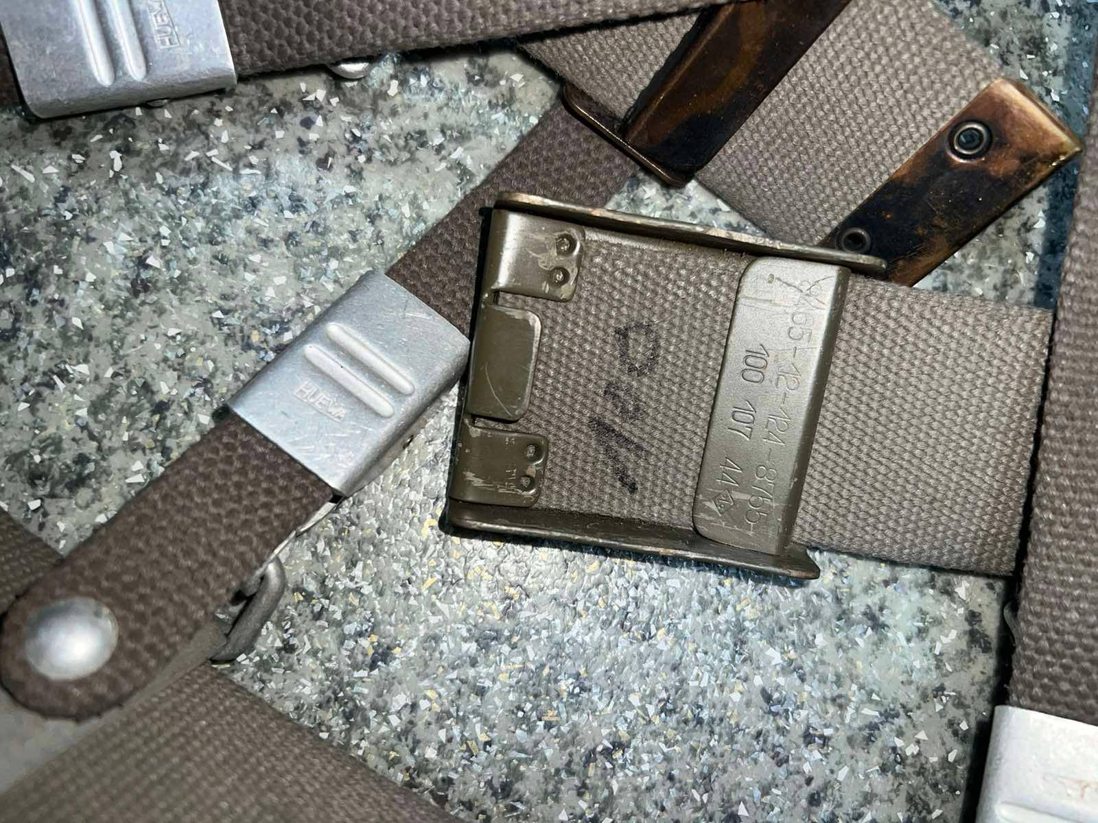 - На одном конце ремня крепится пряжка которая окрашивалась при производстве в оливковый цвет (во время эксплуатации краска часто обдиралась оголяя желтый метал, чтобы выглядеть нарядно, солдаты тех времен максимально счищали краску с пряжки, и полировали ее до золотистого цвета. Чем вызывали огромное недовольство среди своих командиров)