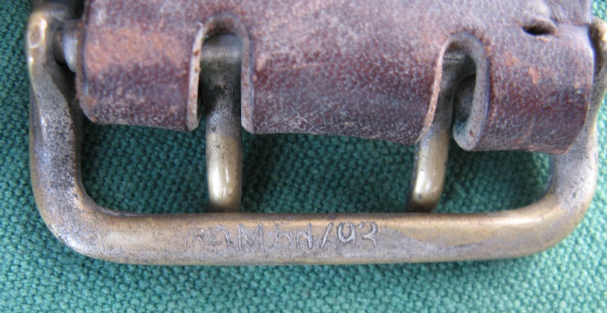 ранній ремінь офіцера (можливо сс, або партійний) шкіра коричнева з потертостями від носіння. пряжка латунна,зерниста з клеймами RZM. ширина полотна 44мм біля пряжки і по довжині розтягнутий до 41-42мм. товщина 3,5мм. довжина 1040мм. бракує тренчика. знайдено на горищі.