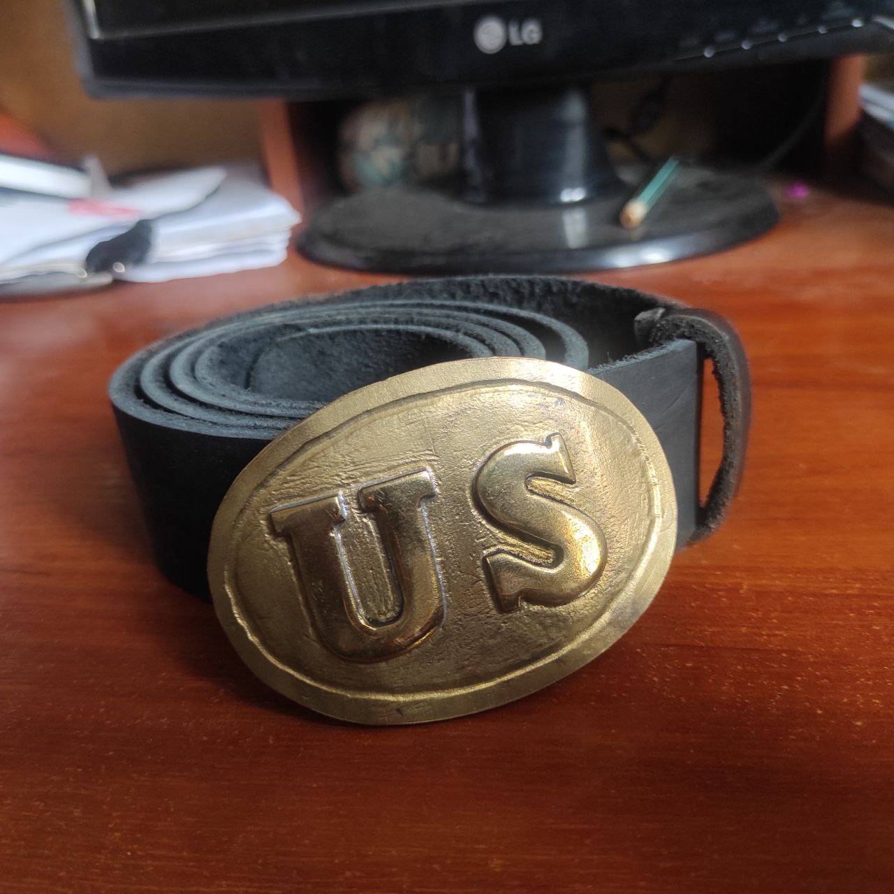Копія ременя часів Громадяньскої війни у США. Бляха латуна , полотно шкіра ширина 4 см, довжина 110 см.