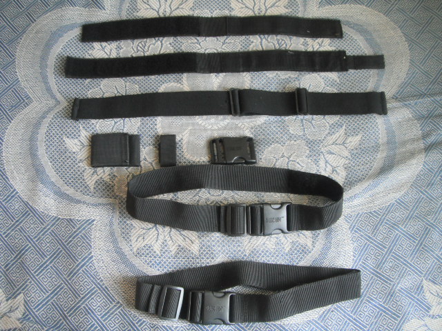 Два ремня - полтора дюйма ( около 38 мм ). С фастексами и скобами для фиксации полотна (максимальный обхват 70 см. ).