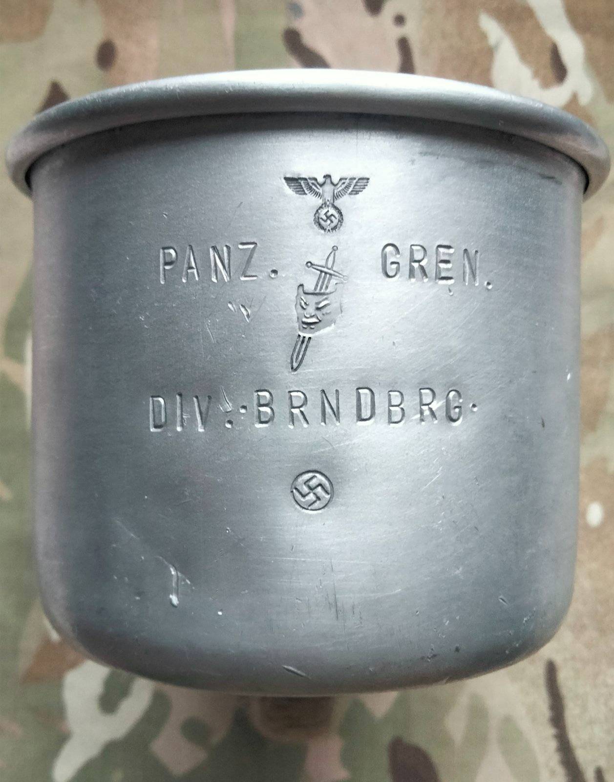 Не пропаганда, для реконів, стендів, колажів, алюміній, закос під окопну творчість, репліка кружки бійця диверсійного підрозділу спецпризначення “Бранденбург-800”, панцер-гренадерська дивізія, кружка б/в, 0,5 л, предмет і клейма сучасні. Оплата на карту Привата, пакую сам. Відправка Укрпошта, або Нова пошта. Кошти від продажу підуть на потреби артдивізіону бойової бригади.