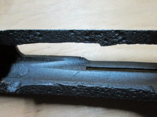 Ствольная коробка на ВМ.Копаная.Почистил электролизом.Геометрия в норме, была одна глубокая раковина-заварил полуавтоматом и зачистил.Видно на фото.Места под посадки остальных деталей и плоскости скольжения затвора в хорошем состоянии.Один из боевых упоров побило коррозией, другой хороший.Постарался отобразить на фото.Исходя из этого предположу что на СХП может и не пойти(хотя я не проверял),но на макет вполне,резьбы все целые.Затвор становится без проблем-на фото.Немного подворонил в масле.